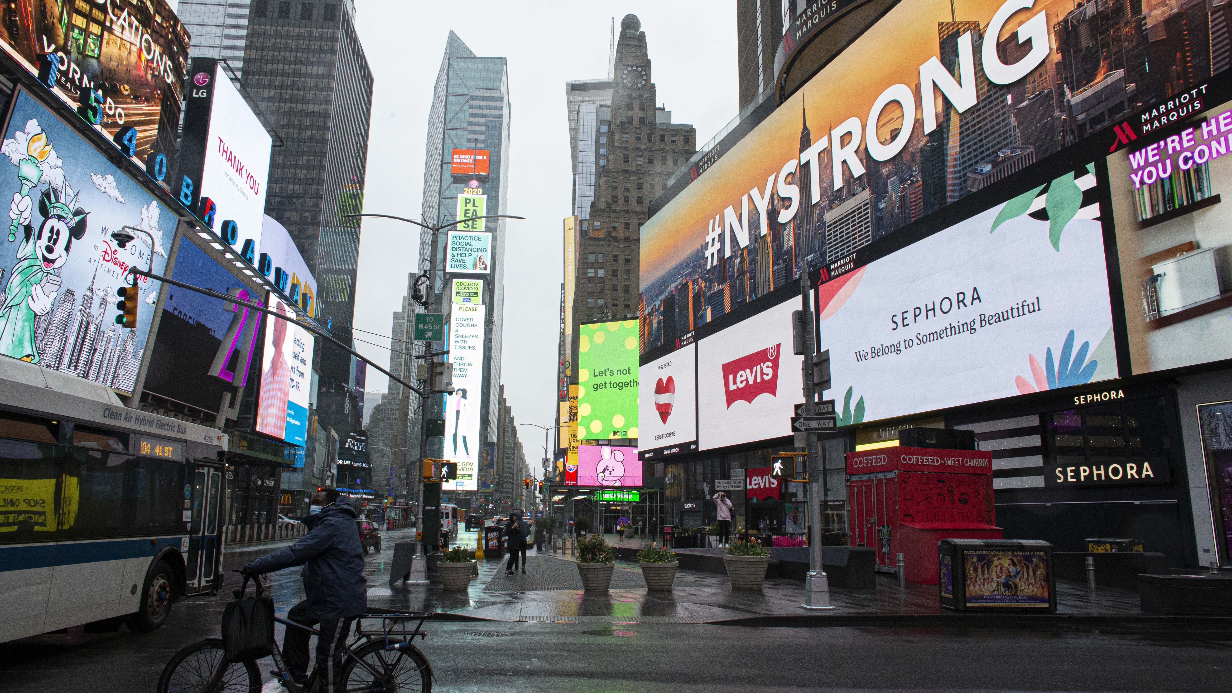 A man rides a bike in Times Square amid the coronavirus pandemic on April 26, 2020 in New York City. Kena Betancur / Agence France-Presse / AFP