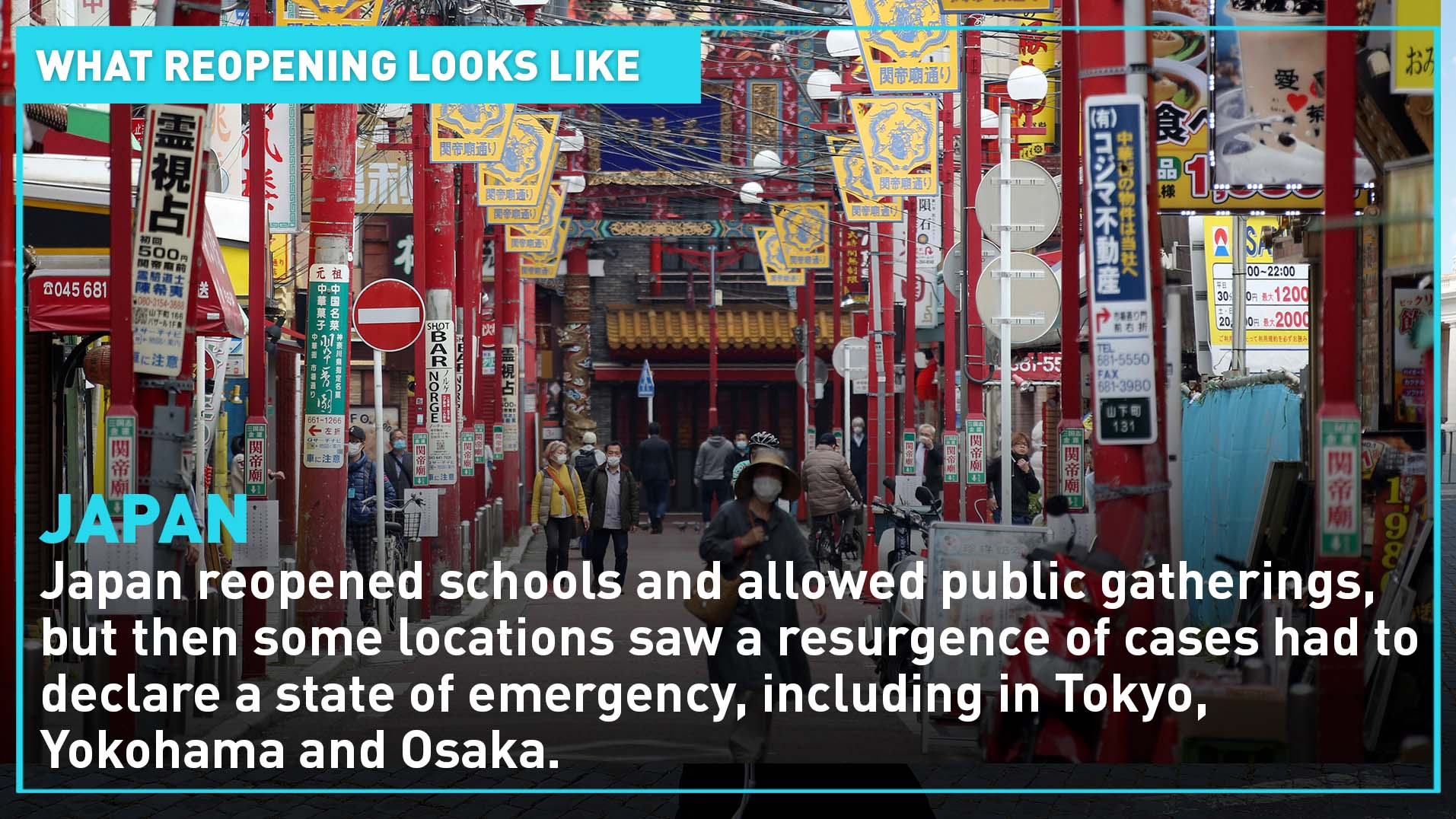 * Japan reopened schools and allowed public gatherings, but then some locations saw a resurgence of cases and had to declare a state of emergency, including in Tokyo, Yokohama and Osaka.