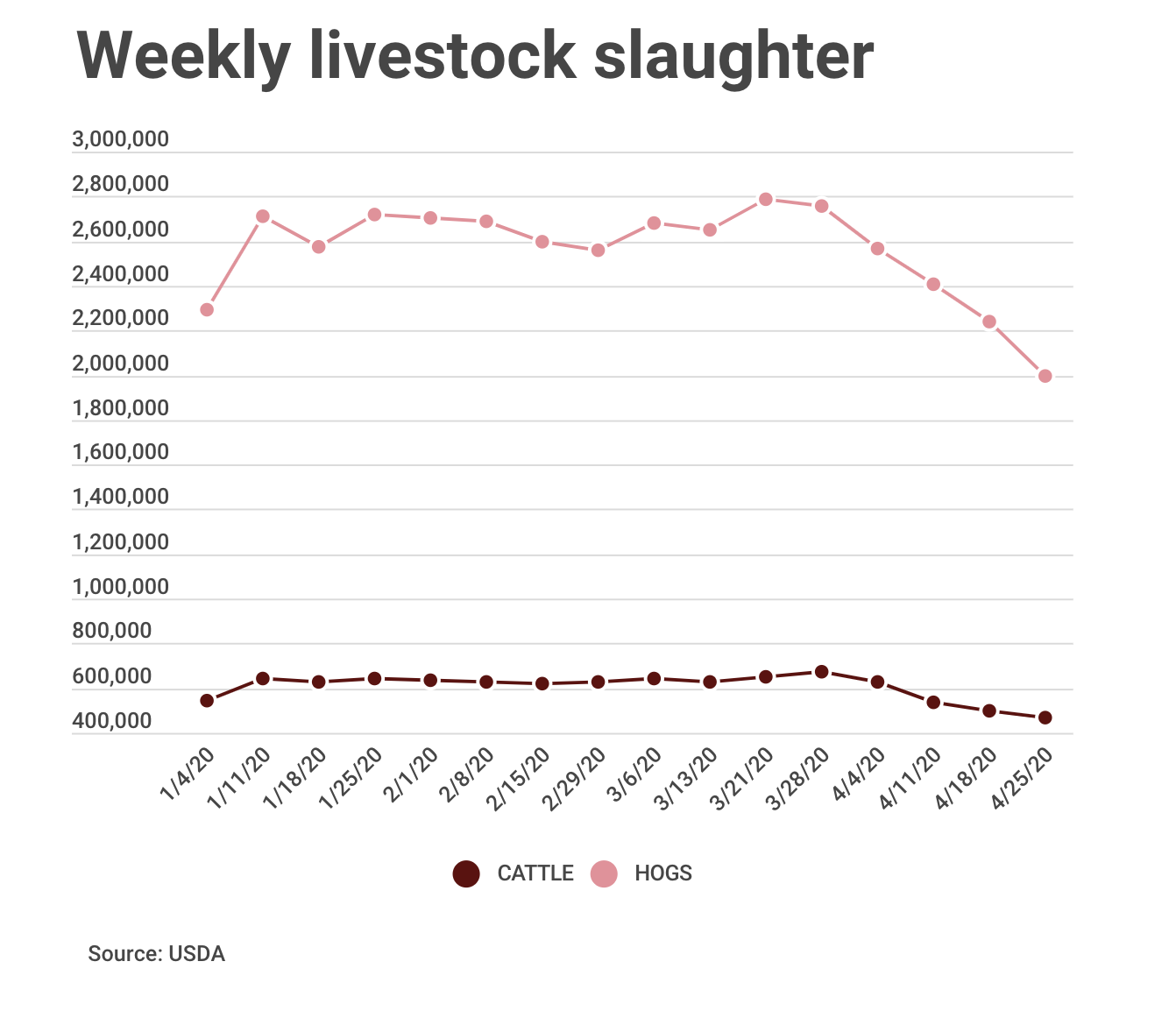 In the last month, meat slaughters have declined significantly, from 2.7 million slaughters on March 28 to about 2 million on April 25, according to USDA data analyzed by CGTN.