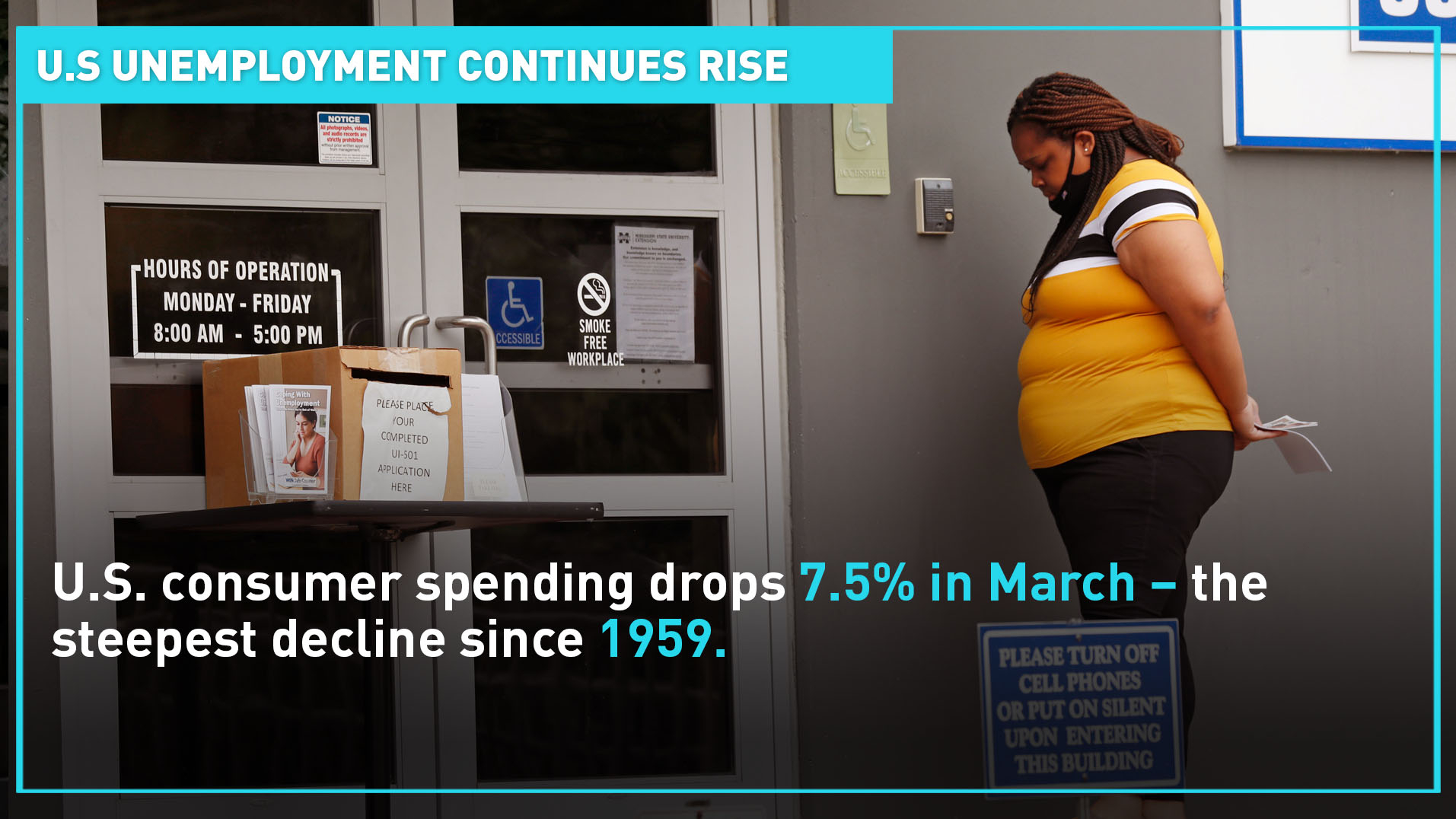 The Commerce Department also said U.S. consumer spending fell by 7.5% in March, the steepest monthly decline in more than 60 years.