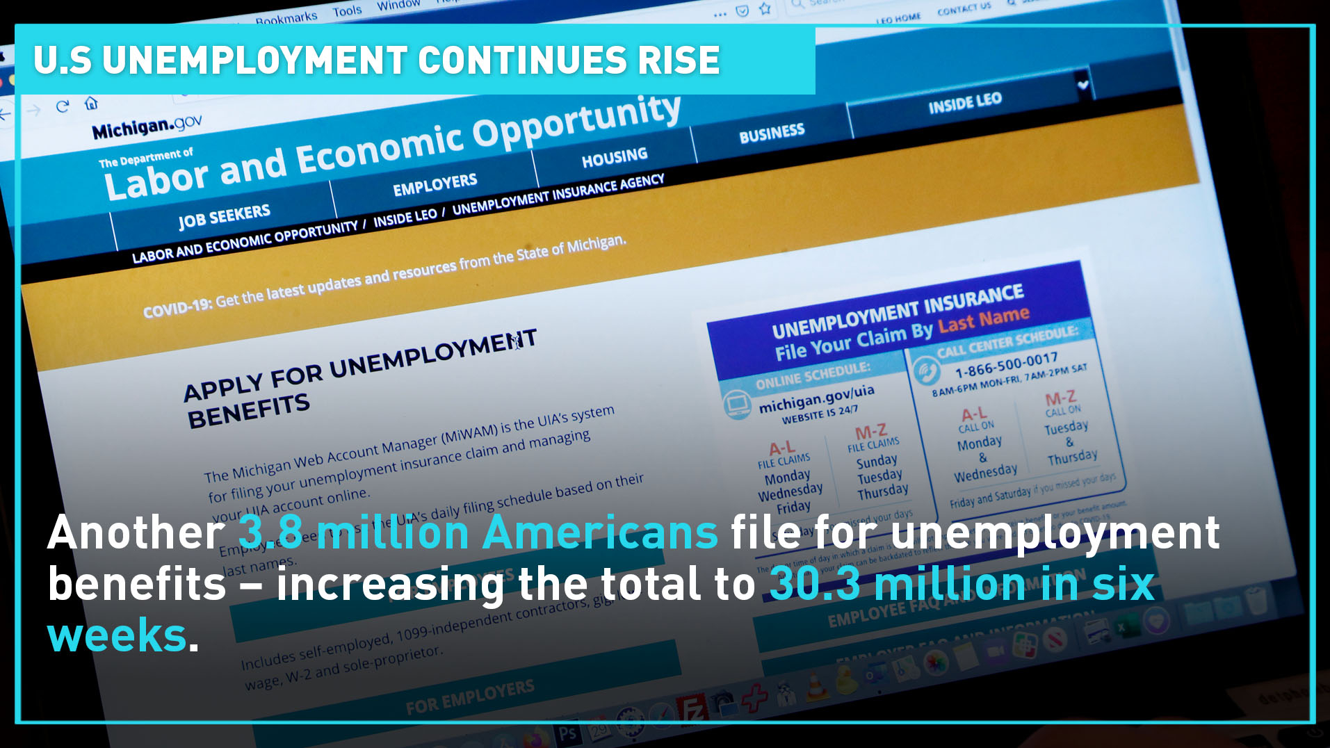 Another 3.8 million Americans filed for unemployment benefits last week. U.S. Department of Labor data shows a total of 30.307 million people lost their jobs in the past month and-a-half alone. A handful of U.S. states say they are ready to reopen their economies.