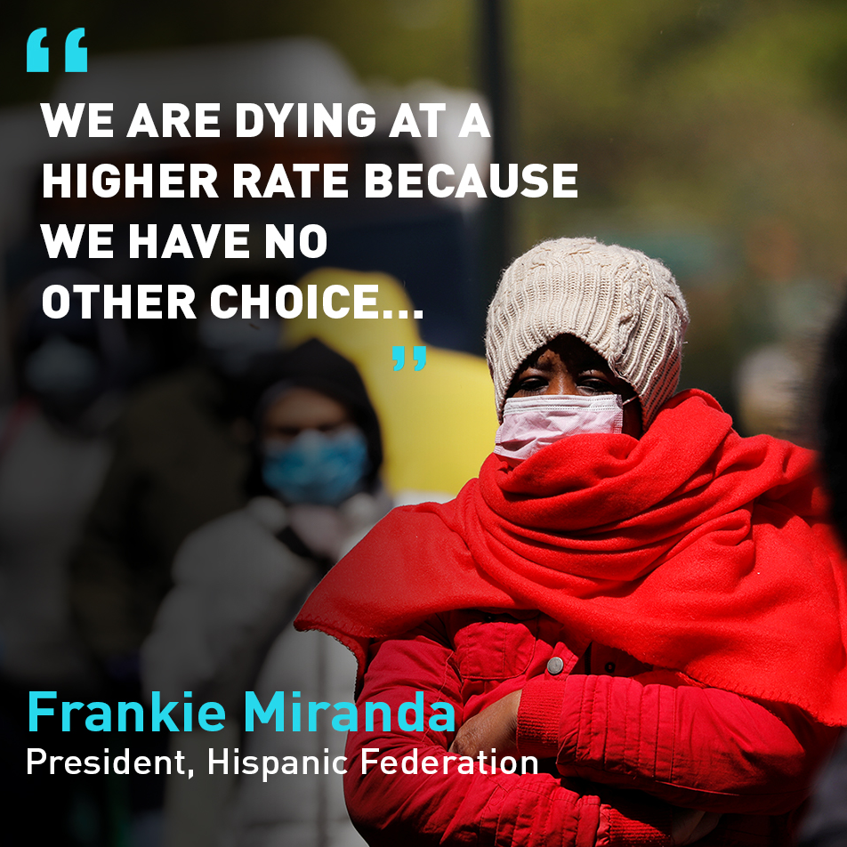 "We are dying at a higher rate because we have no other choice… These are the delivery food people, the people that are the day workers, the farm workers, these are people that are working in restaurants. They are essential services, and now they are not enjoying the protections that maybe in other industries people can have," said Frankie Miranda, president of the Hispanic Federation, to CNN.