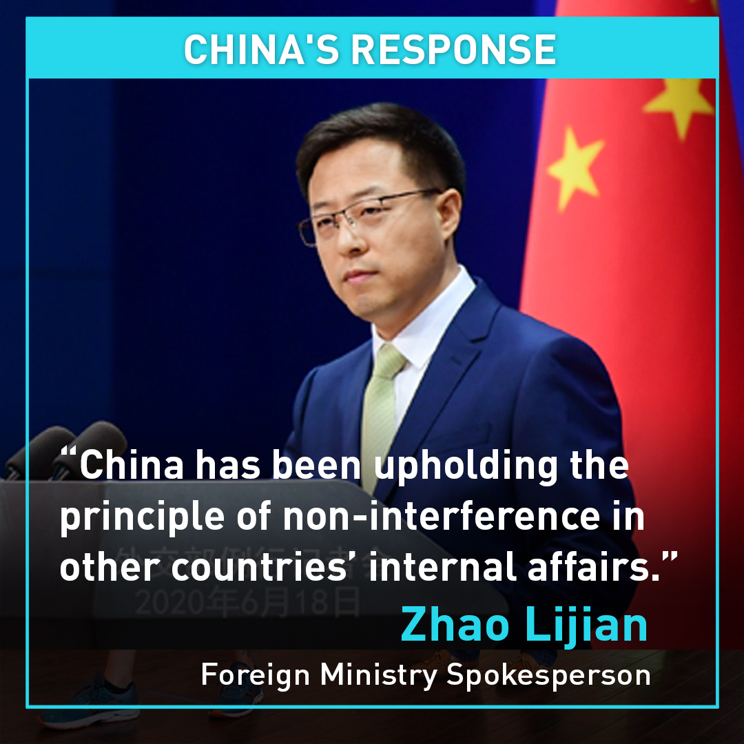 "China has been upholding the principle of non-interference in other countries' internal affairs. We have no intention and will not interfere in the U.S.'s internal affairs and presidential election." Zhao Lijian, Foreign Ministry Spokesperson stressed at a regular briefing.