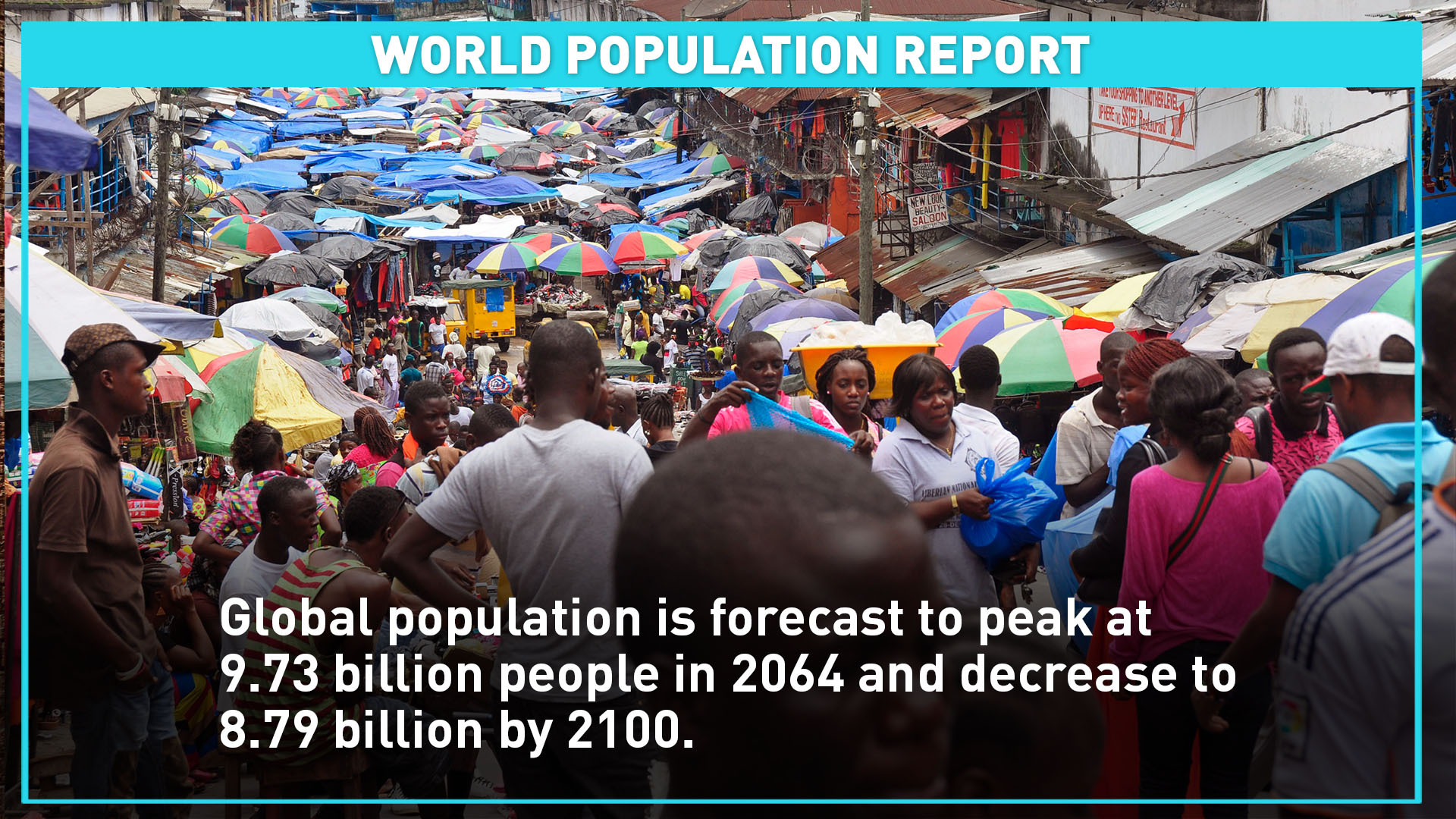 Global population is forecast to peak at 9.73 billion people in 2064 and decrease to 8.79 billion by 2100.