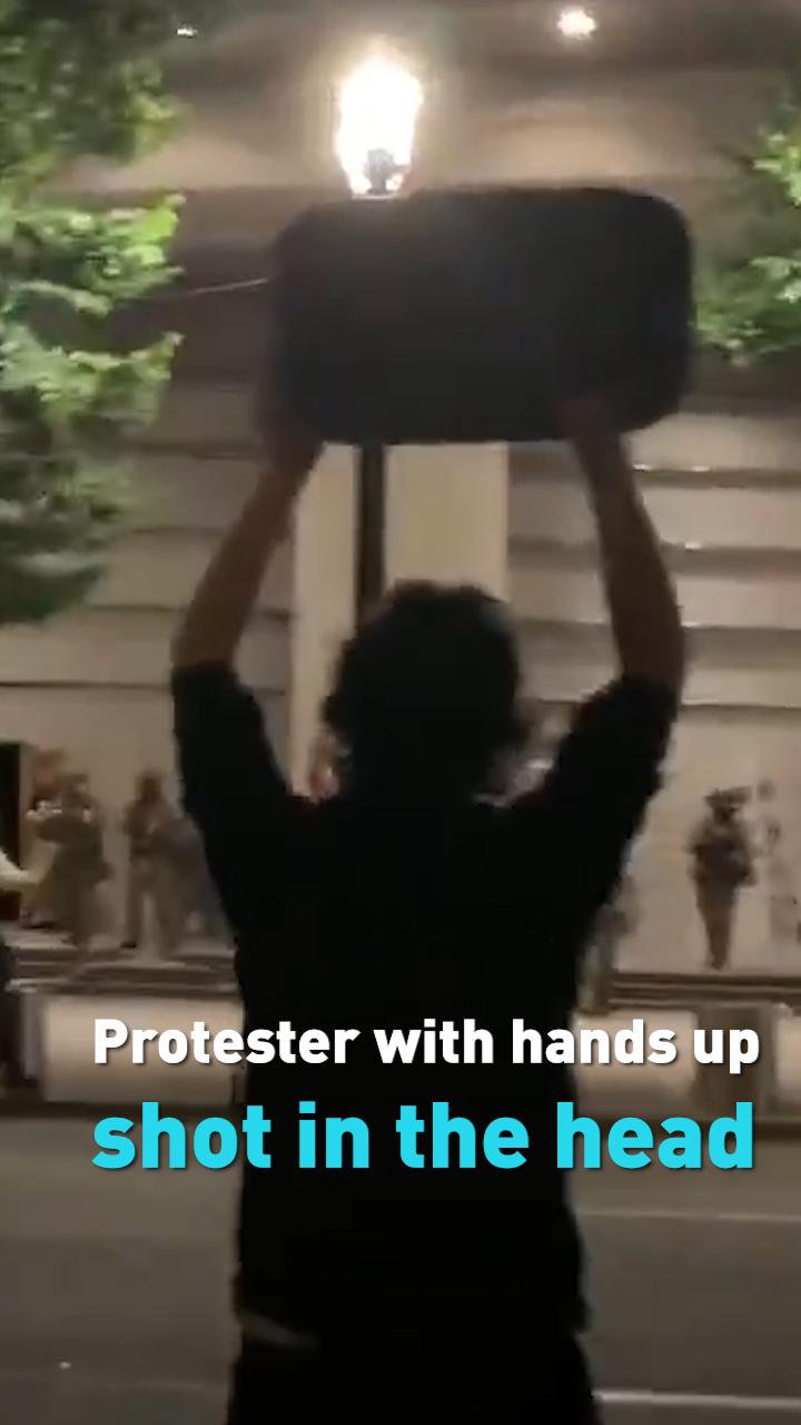 A young man holding a speaker over his head was shot by a U.S. Federal Police officer in Portland, Oregon. The demonstrator was seen apparently tossing a gas canister back in the direction of police before being hit.