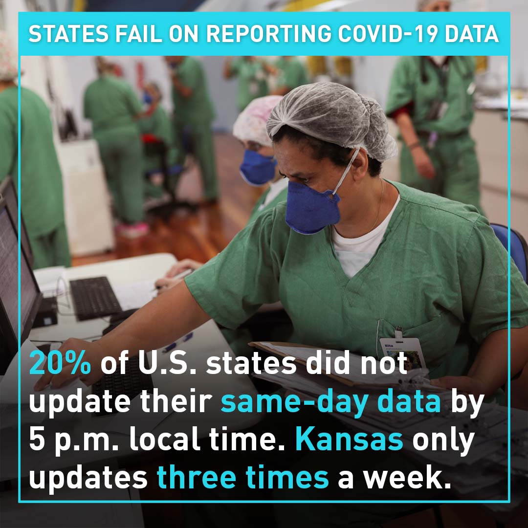 Timely data reporting is "essential" to make informed public health decisions, the report said. But 20% of "state dashboards did not update their dashboards did not report same-day data by 5 p.m. local time." Two states displayed data that is two or more days old.
