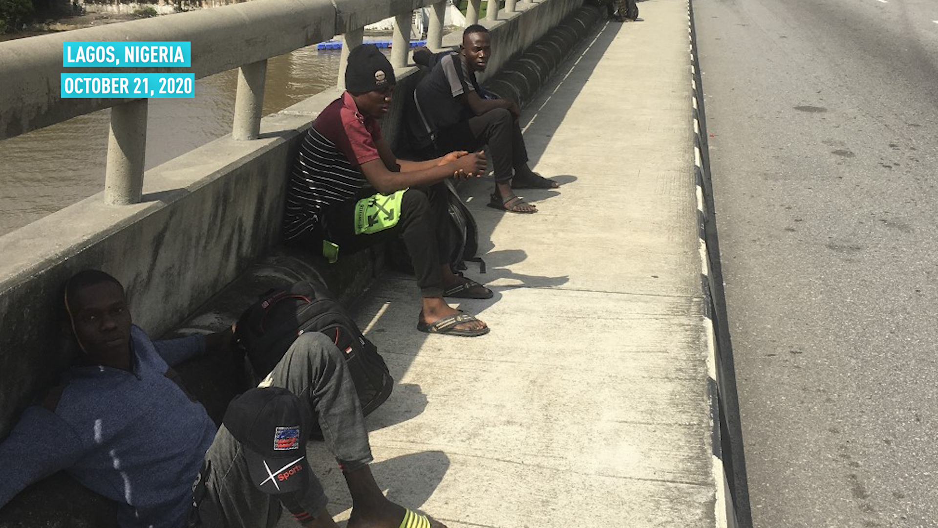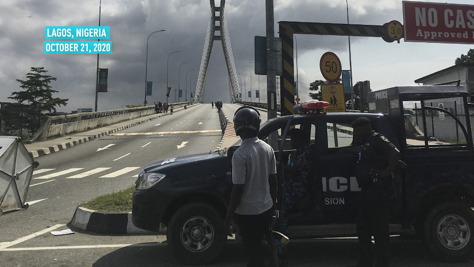 There is a police blockade at the Lekki-Ikoyi toll gate Wednesday, where about 20 people, blocked by curfew, have been facing law enforcement since Tuesday.