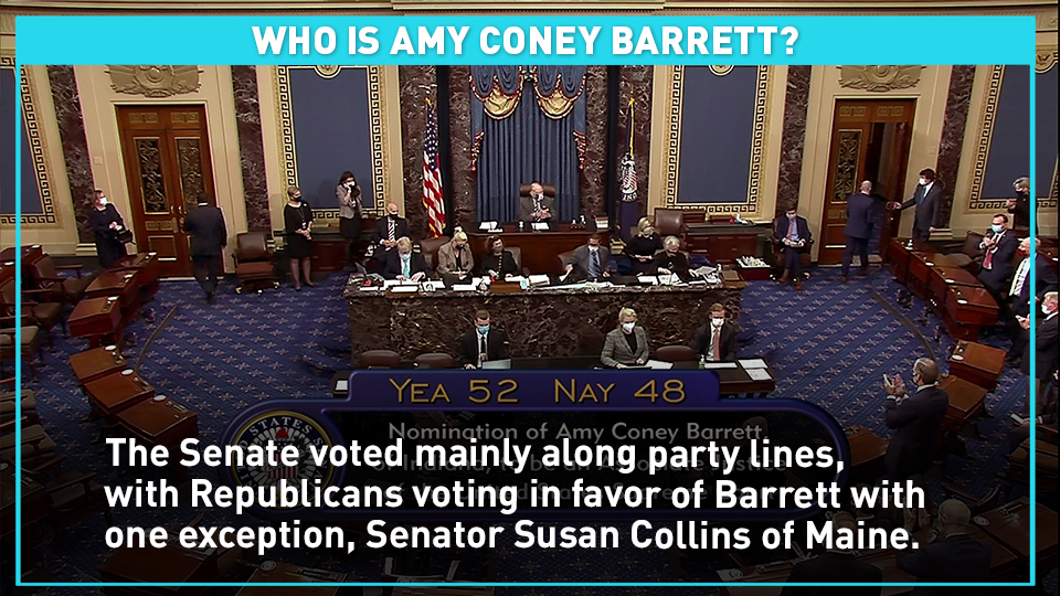 The Senate voted mainly along party lines, with Republicans voting in favor of Barrett with one exception, Senator Susan Collins of Maine. the court now holds a conservative 6-3 majority.
