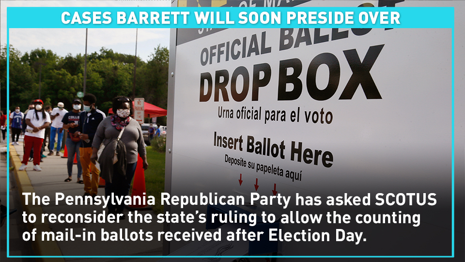 • The Pennsylvania Republican Party has asked SCOTUS to reconsider a case involving mail-in ballots in the state. The state Supreme Court recently decided some mail-in ballots received after Election Day should be counted. If this decision is overturned, some fear it could impact how Pennsylvania and its Republican-controlled legislature will choose the electors who will vote for the presidency.