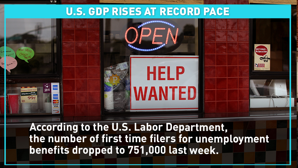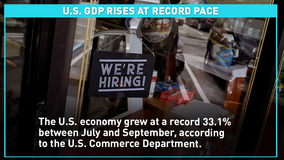The U.S. economy grew at a record 33.1% between July and September, according to the U.S. Commerce Department.