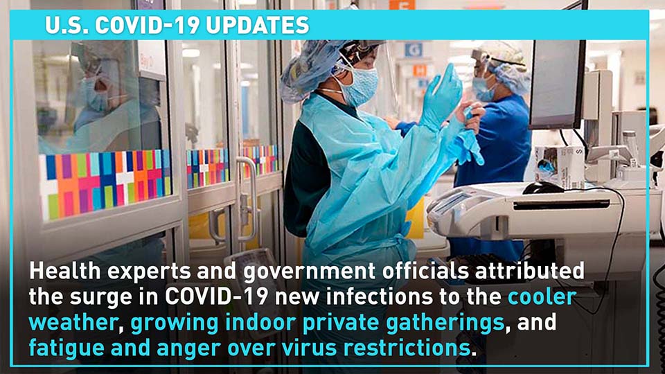 Health experts and government officials attributed the surge in COVID-19 new infections to the cooler weather, growing indoor private gatherings, and fatigue and anger over virus restrictions.