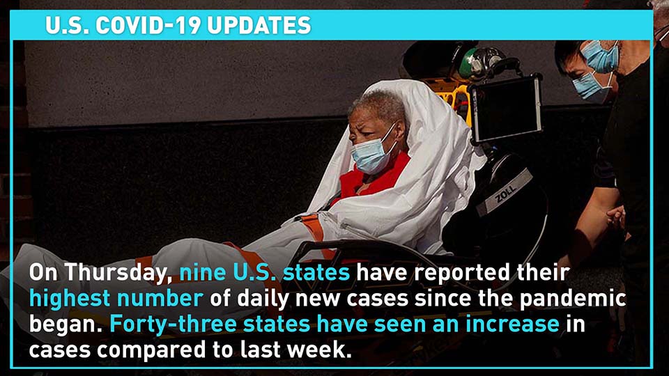 On Thursday, nine U.S. states have reported their highest number of daily new cases since the pandemic began. Forty-three states have seen an increase in cases compared to last week.