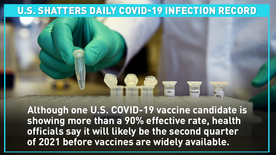 Although at least one U.S. COVID-19 vaccine candidate is showing more than a 90% effective rate, the U.S. Department of Health and Human Services says it will likely be the second quarter of 2021 before vaccines are widely available.