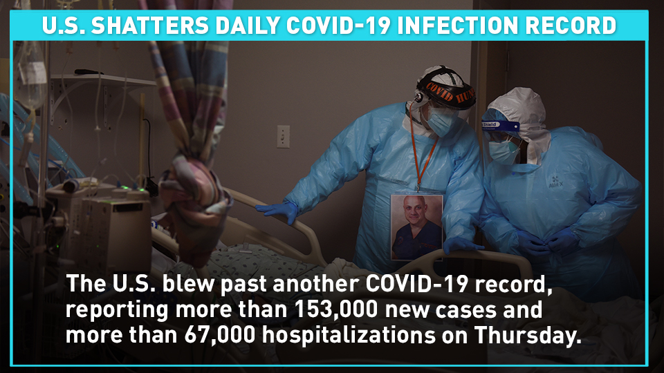 The U.S. blew past another COVID-19 record, reporting more than 153,000 new cases and more than 67,000 hospitalizations on Thursday.
