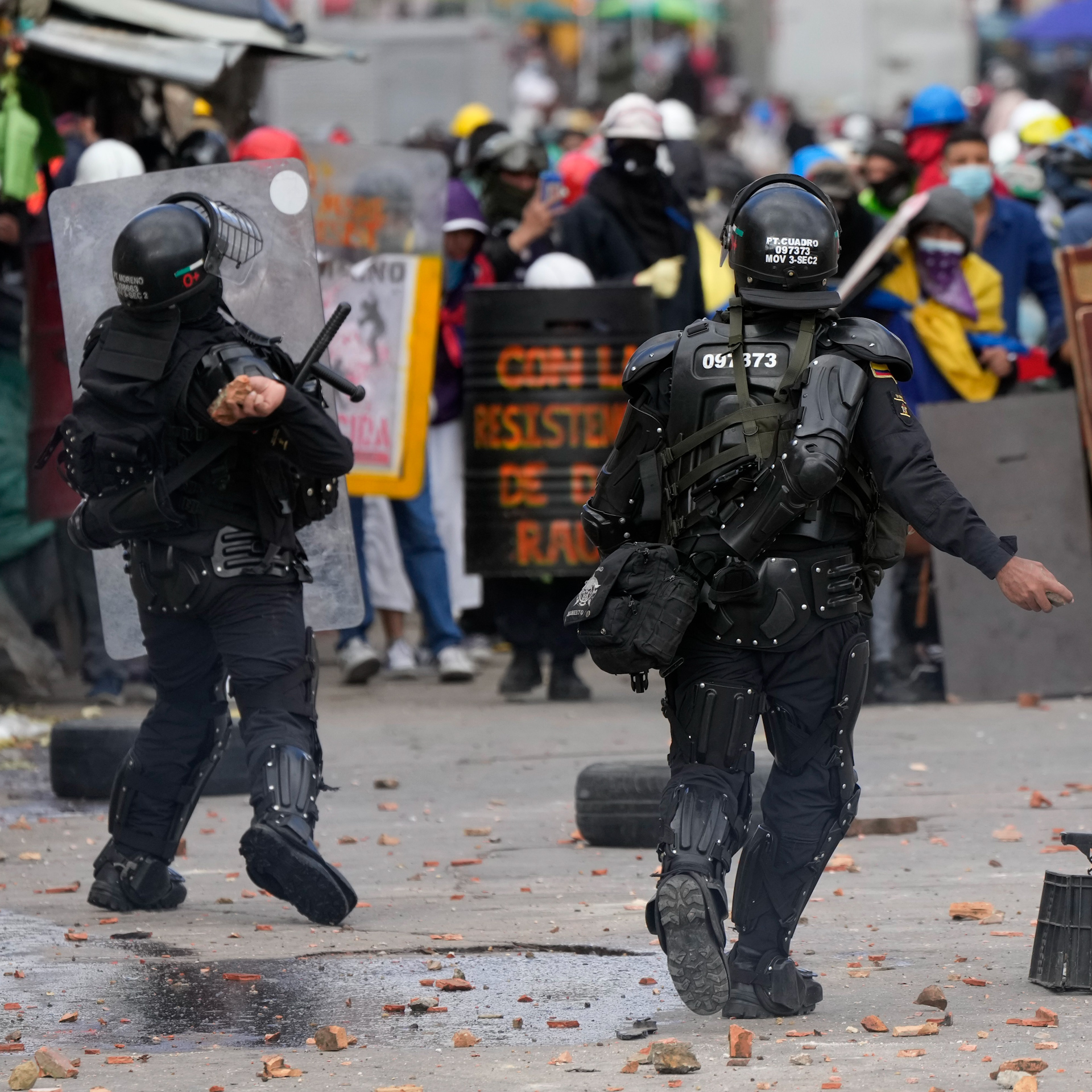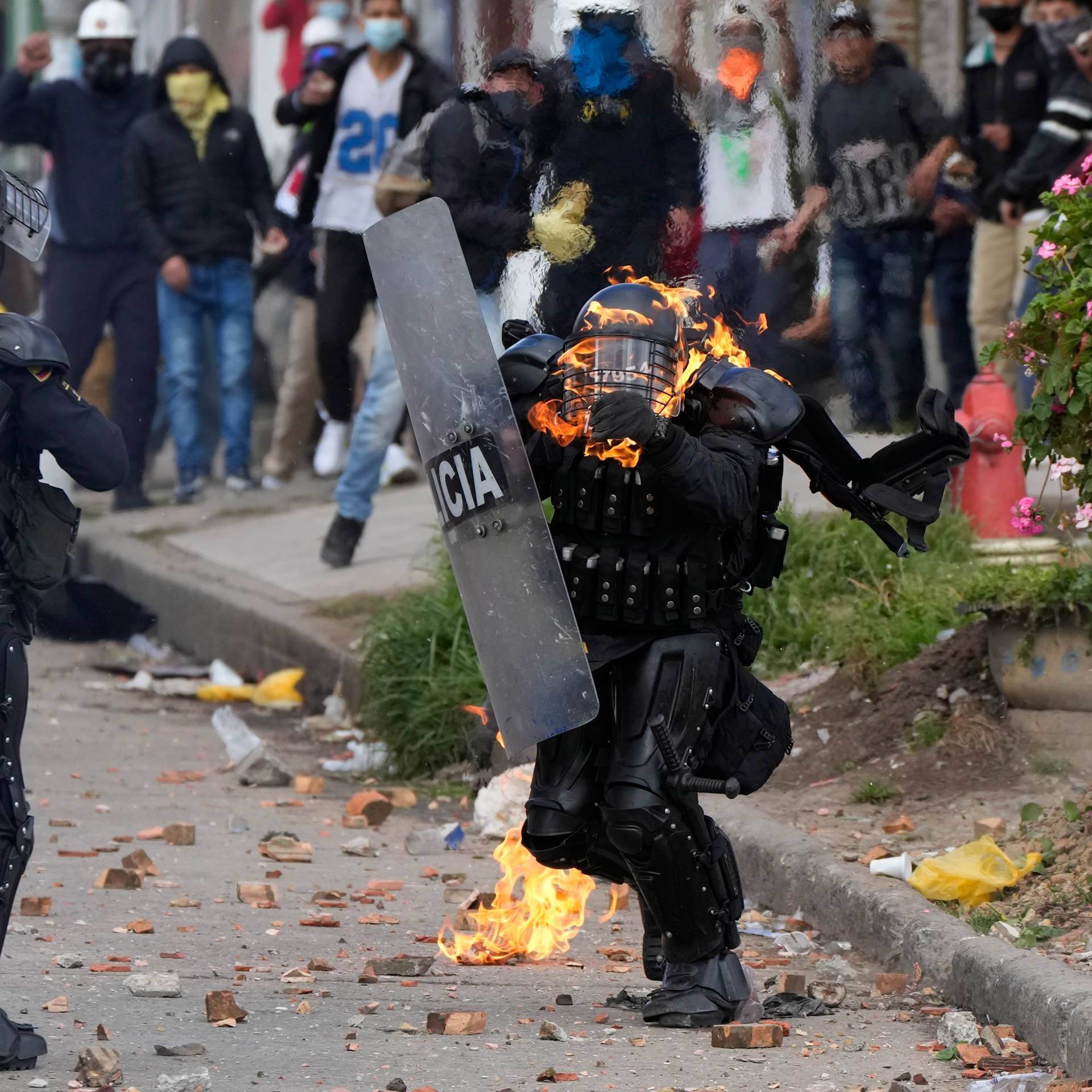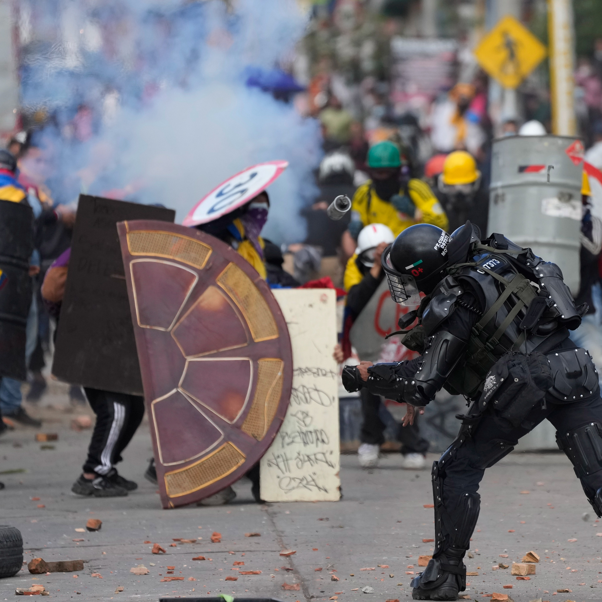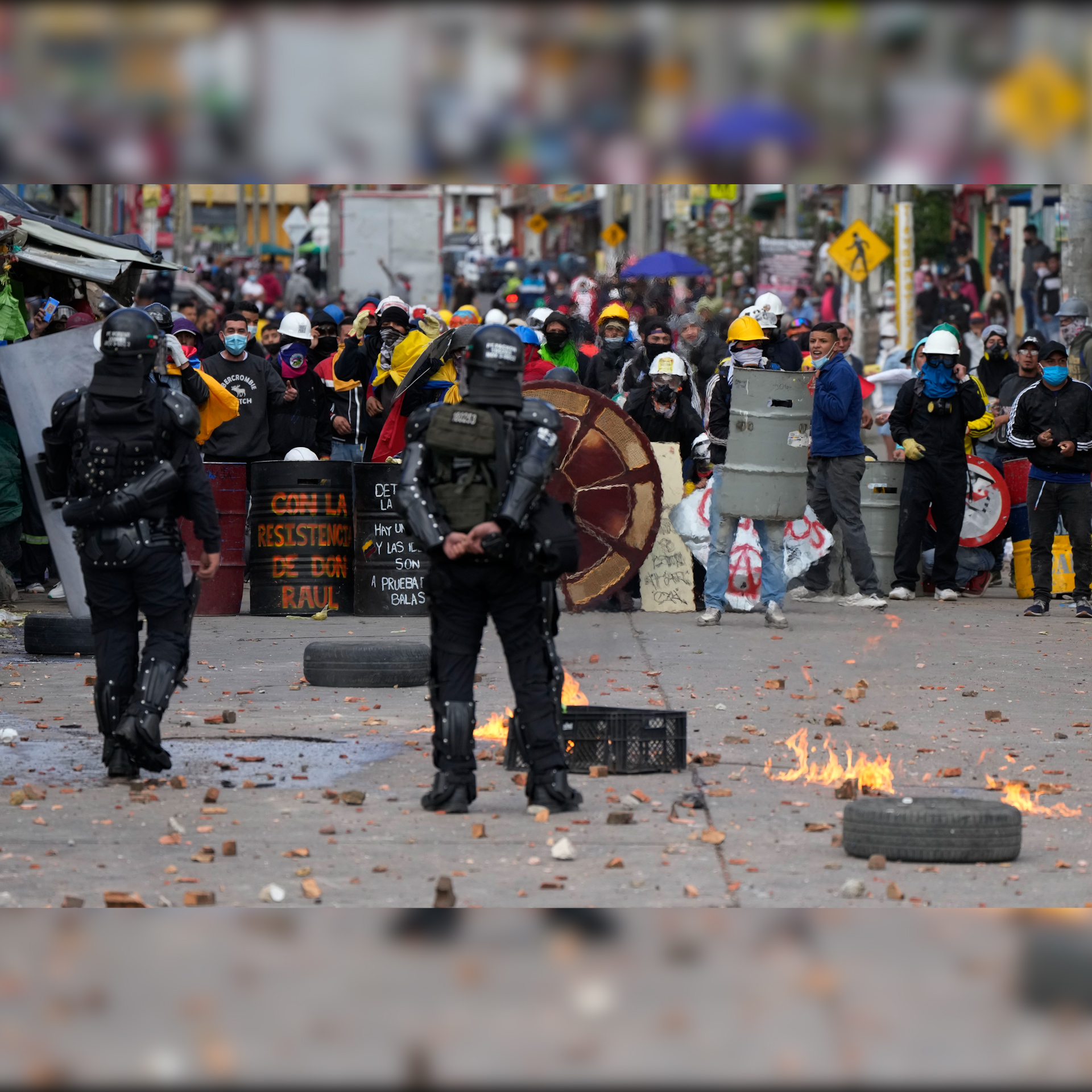 Police and protesters clash during continuing anti-government demonstrations triggered by proposed tax increases on public services, fuel, wages, and pensions in Bogota, Colombia. Over 60 people have died in demonstrations over the last 2 months.