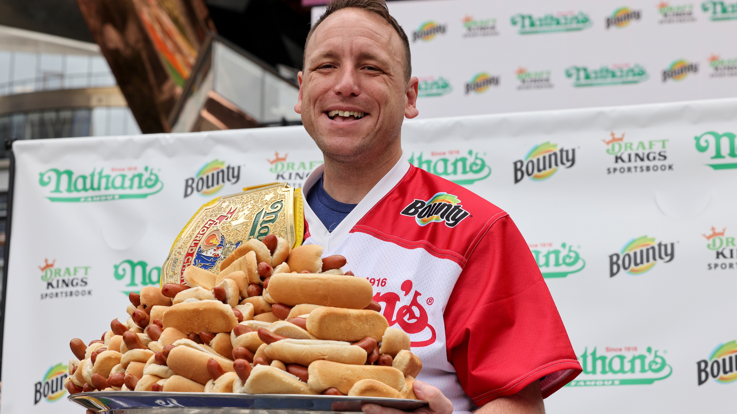 Joey Chestnut broke his own world record Sunday, eating 76 hot dogs with buns. It's his 14th "mustard belt" in the last 15 years.