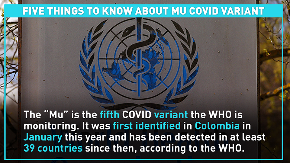 The "Mu" is the fifth COVID variant the WHO is monitoring. It was first identified in Colombia in January this year and has been detected in at least 39 countries sine then, according to the WHO.
