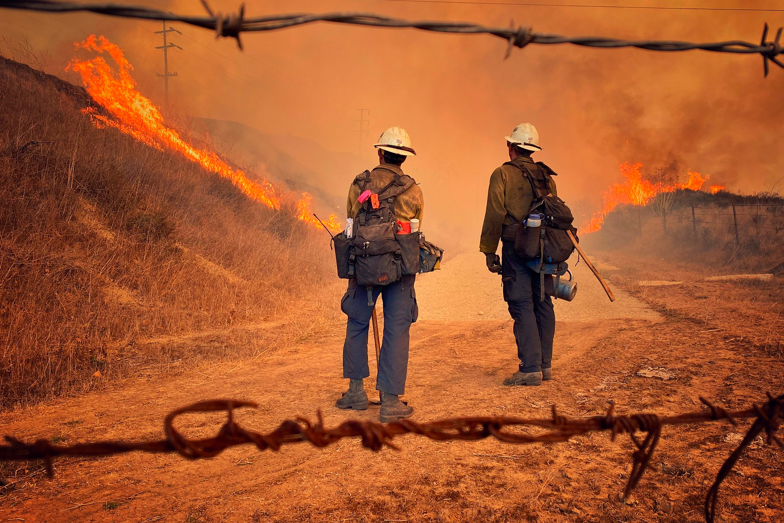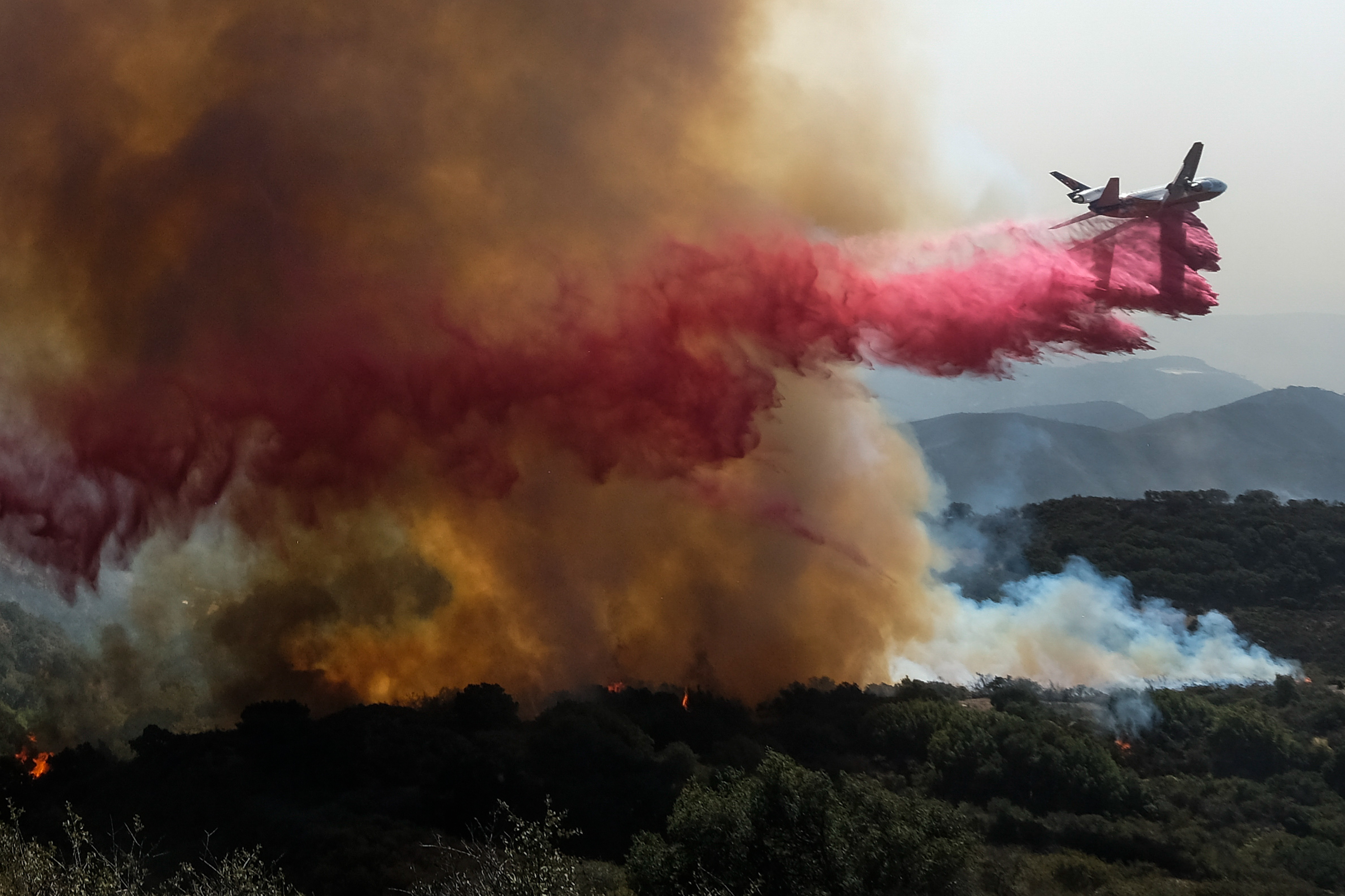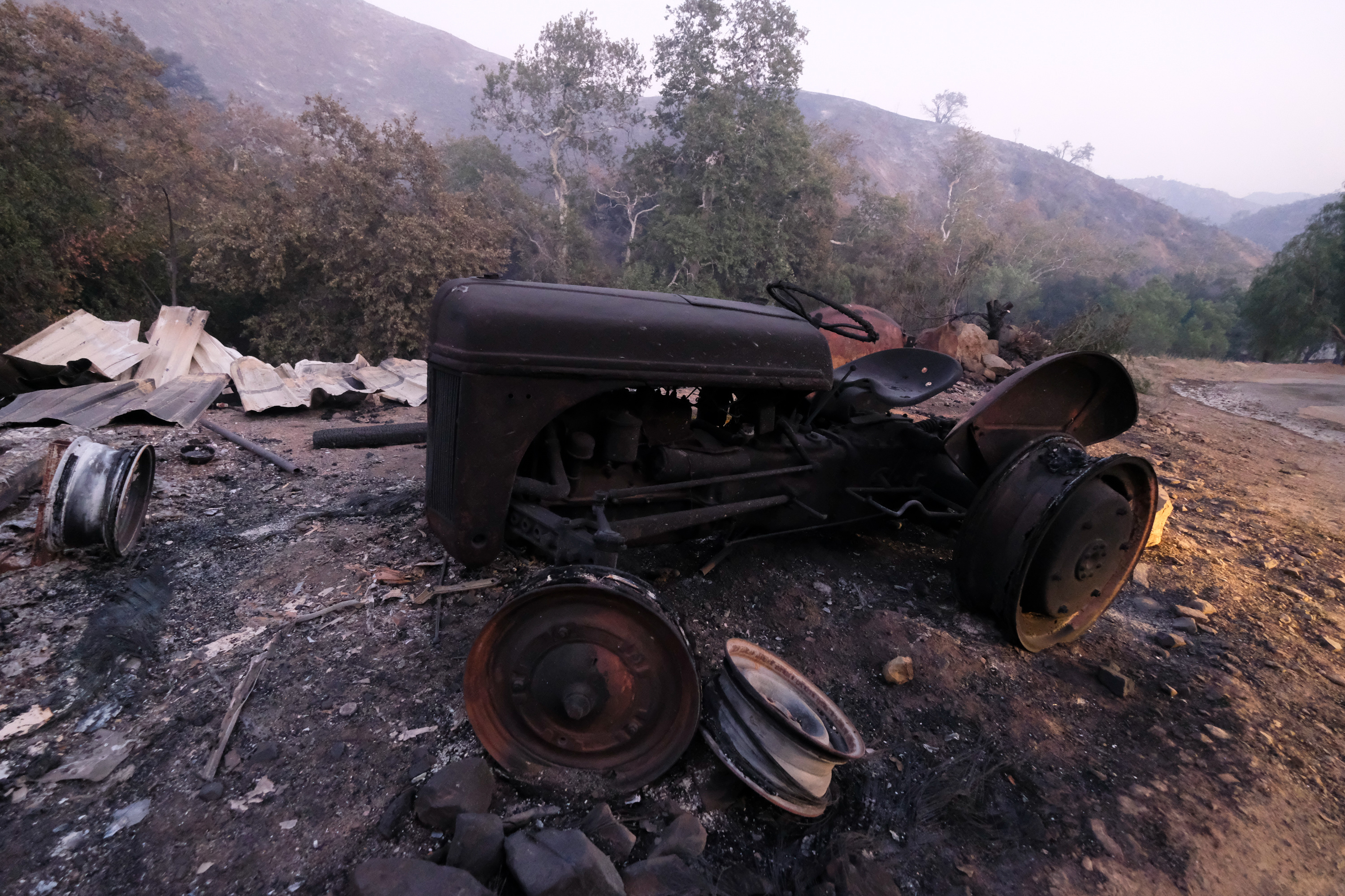 A wildfire raging through Southern California's coastal mountains still threatens ranches and rural homes.