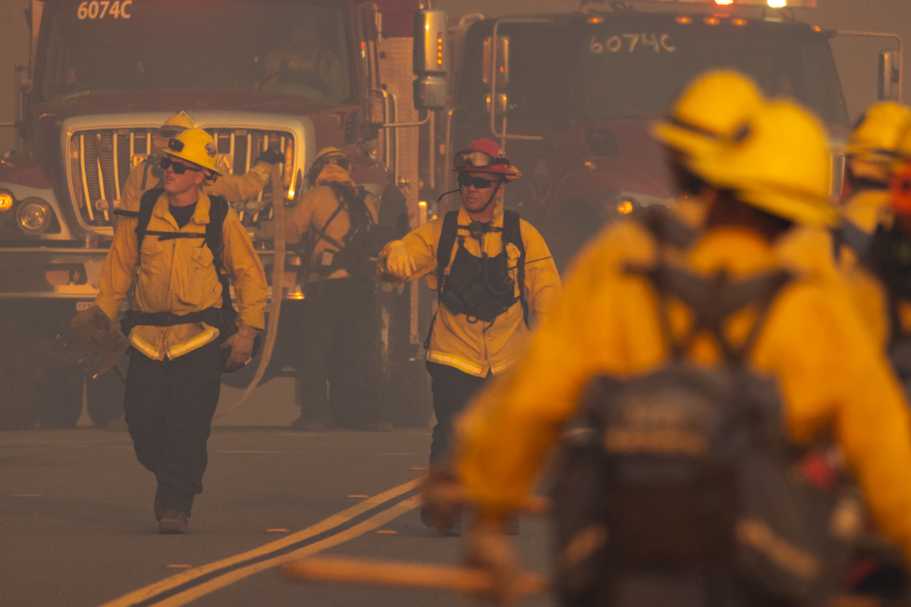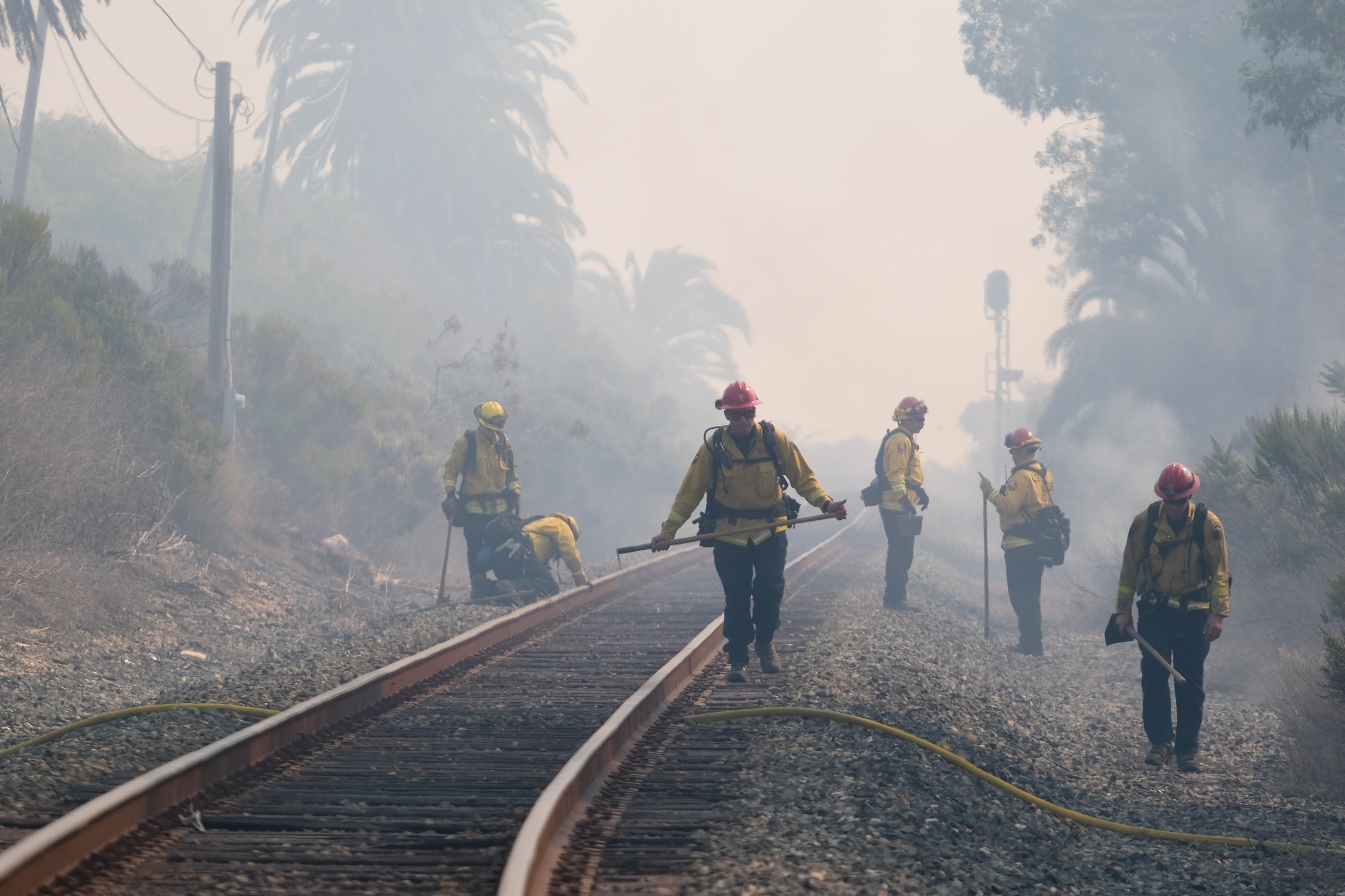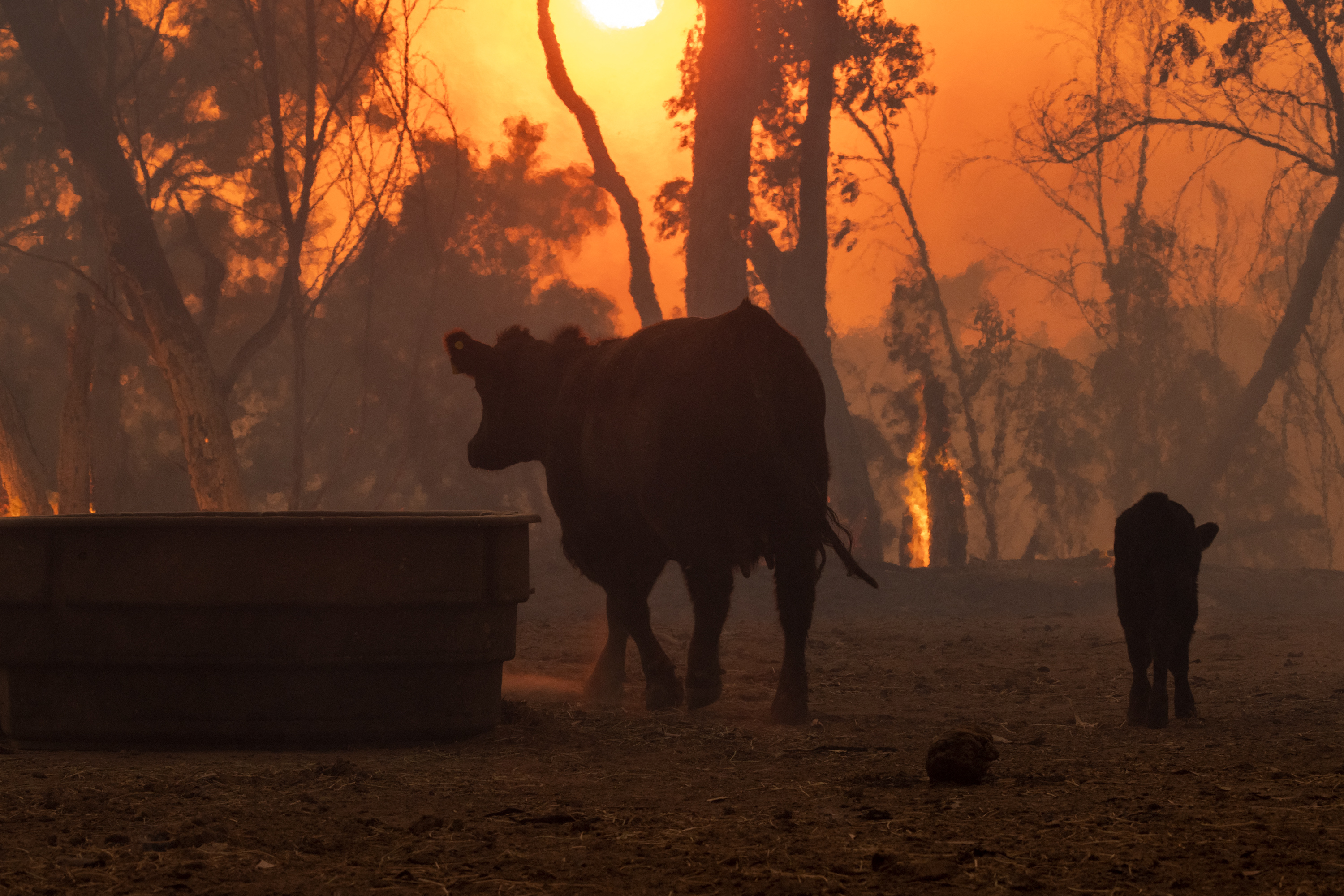A wildfire raging through Southern California's coastal mountains still threatens ranches and rural homes.