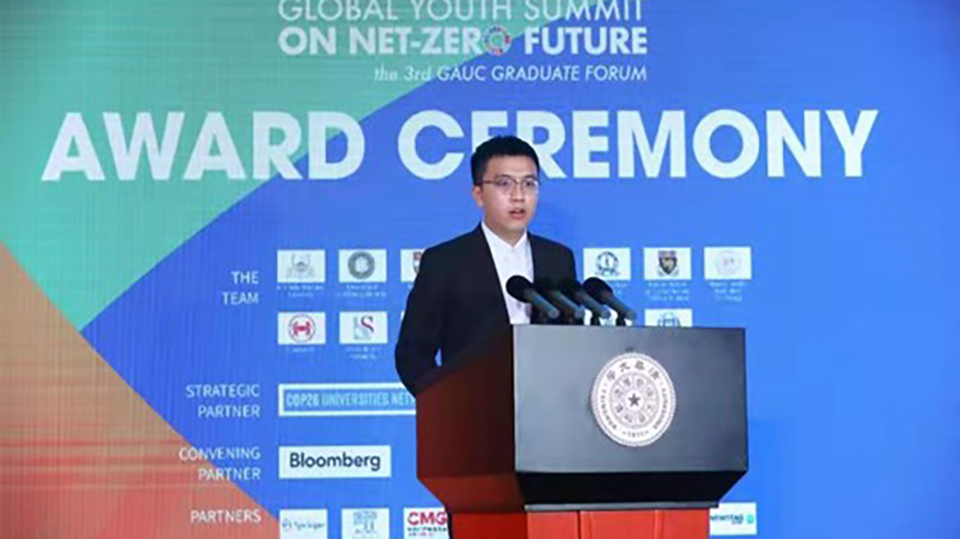 10 graduate students won honors for their outstanding research on the synergy between climate and other areas, namely Nature/Biodiversity, Energy, Health/Food, Transportation, and the UN's Sustainable Development Goals (SDGs). Deng Zhu, a Ph.D candidate at Tsinghua, presented his award-winning research.