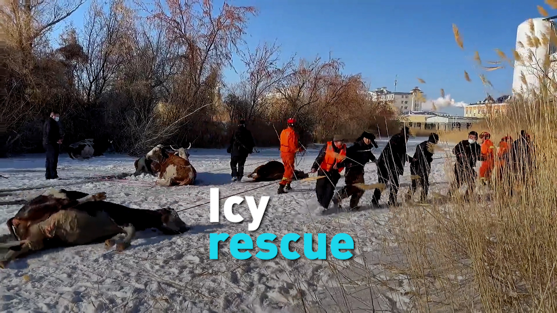 See what happened when emergency crews were called to the scene where a herd cows fell through the ice in northwestern China.