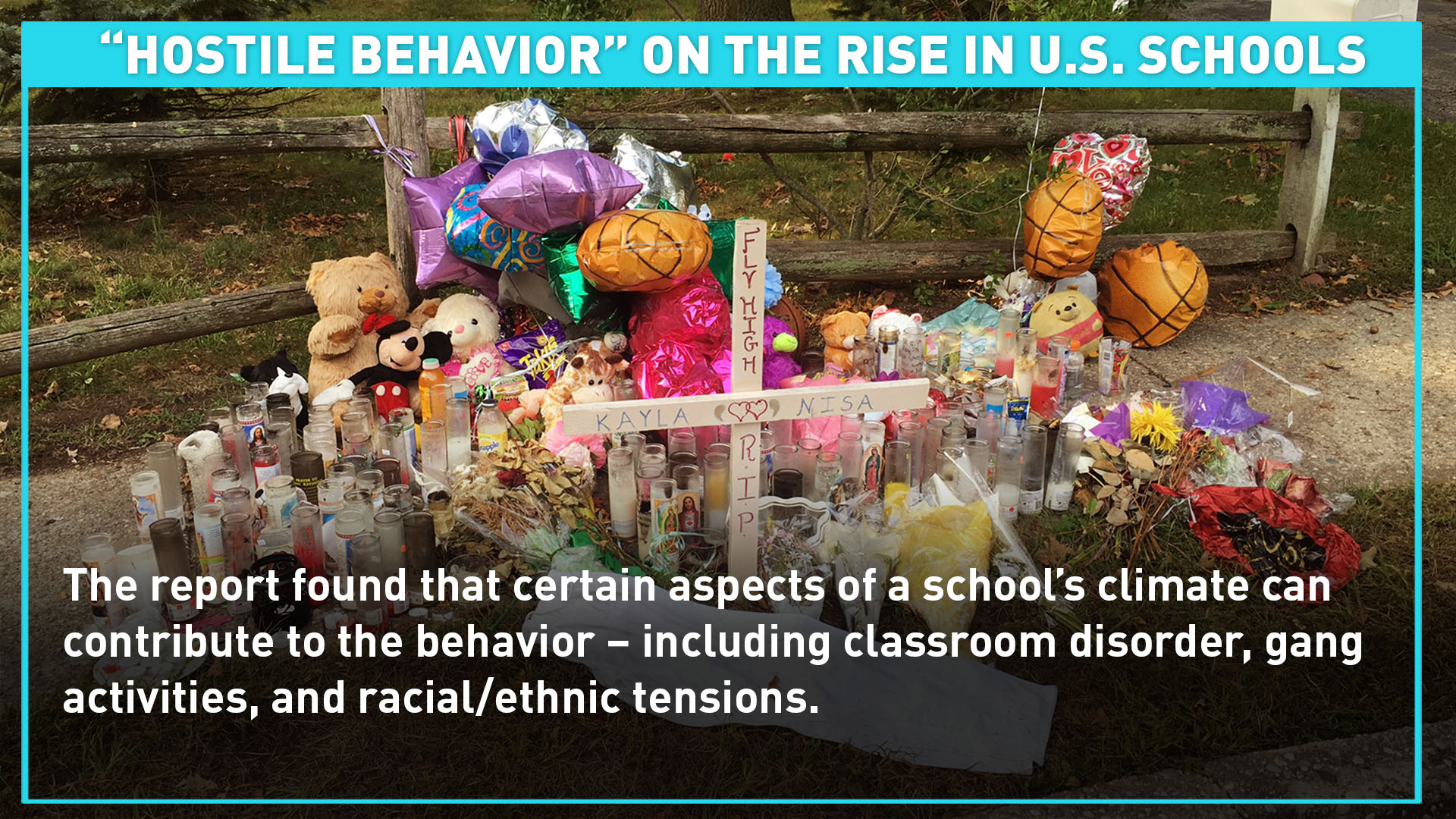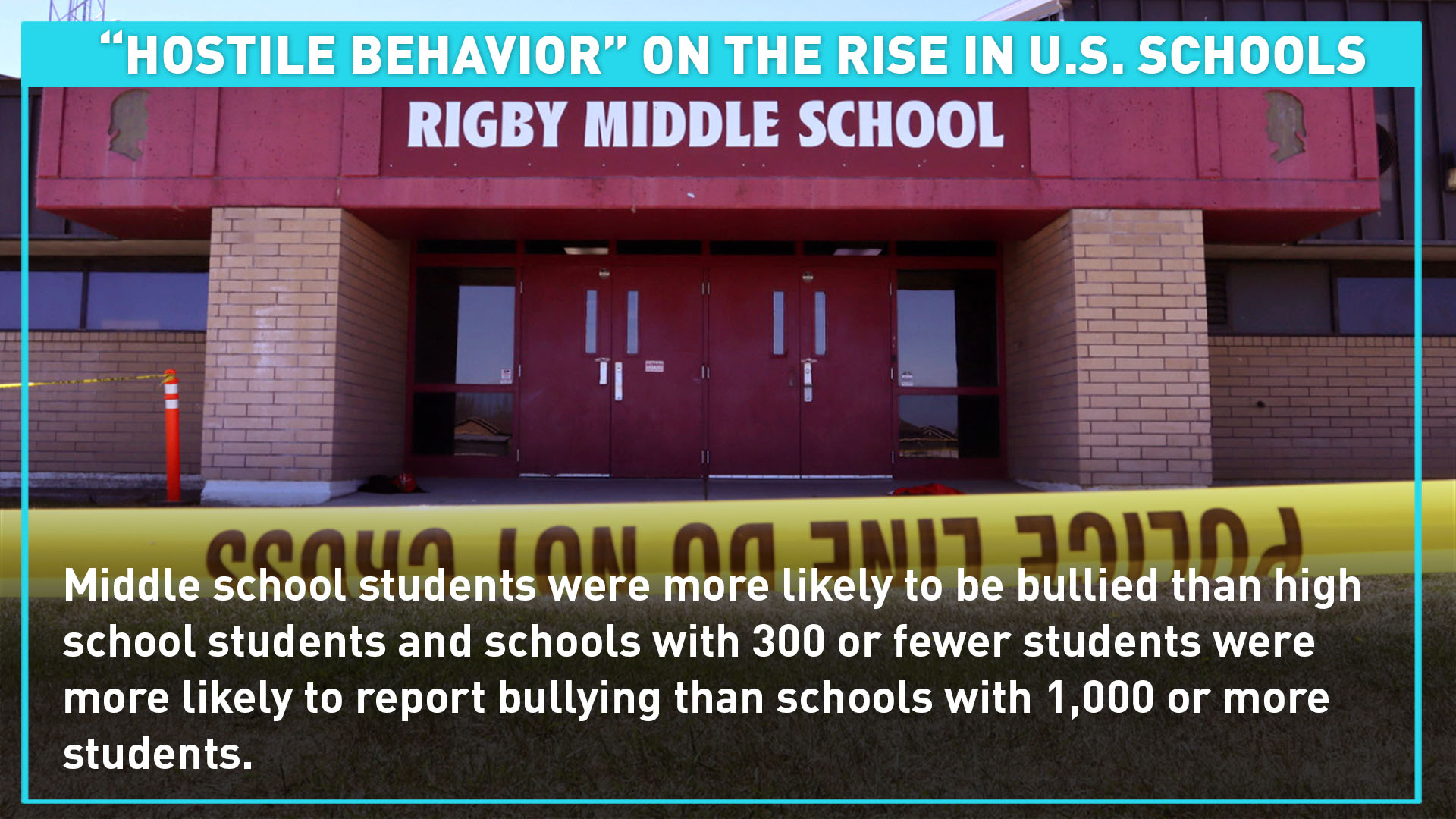 The report says while controlling for key school or student characteristics, certain aspects of the school climate were more associated with bullying, including disorder in the classroom, student verbal abuse and disrespect for teachers, gang activities, and racial/ethnic tensions.