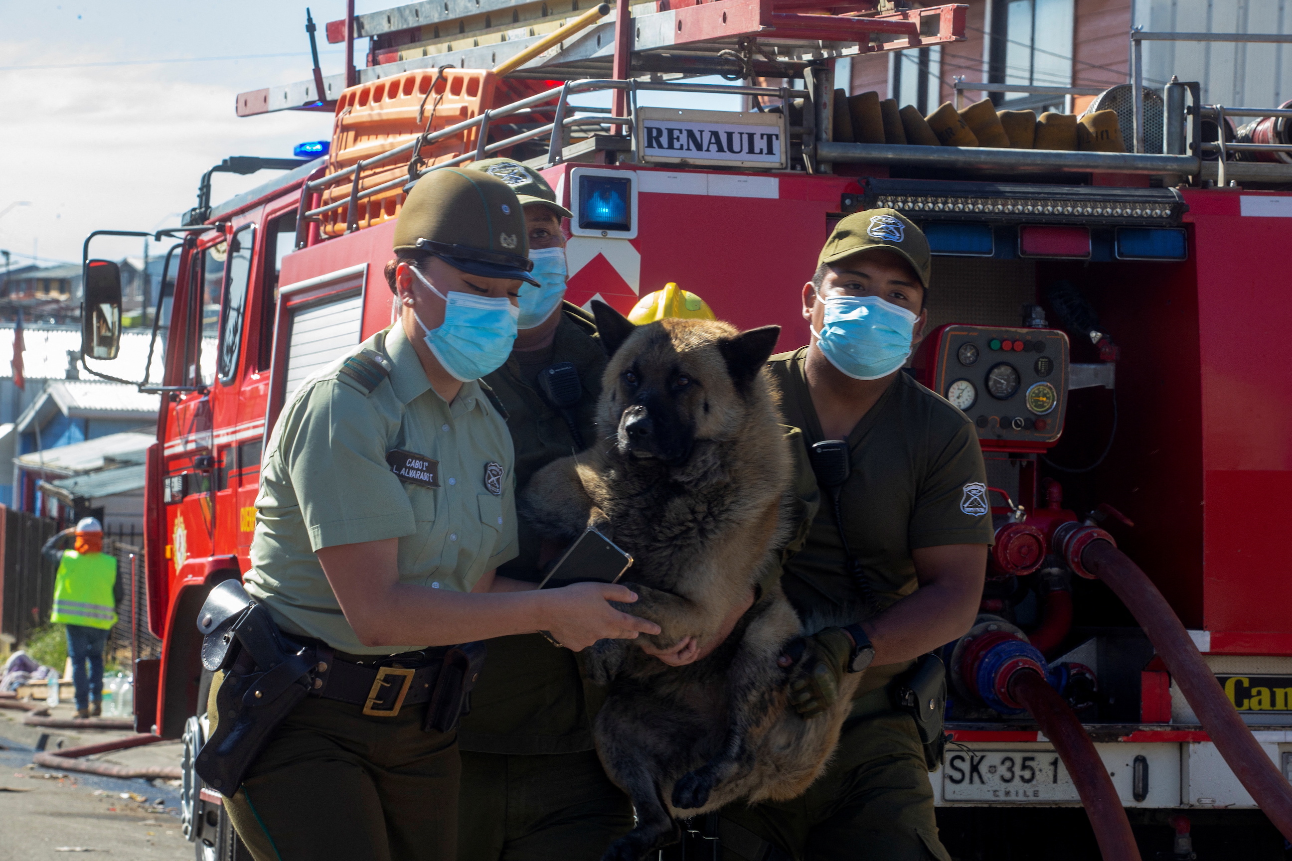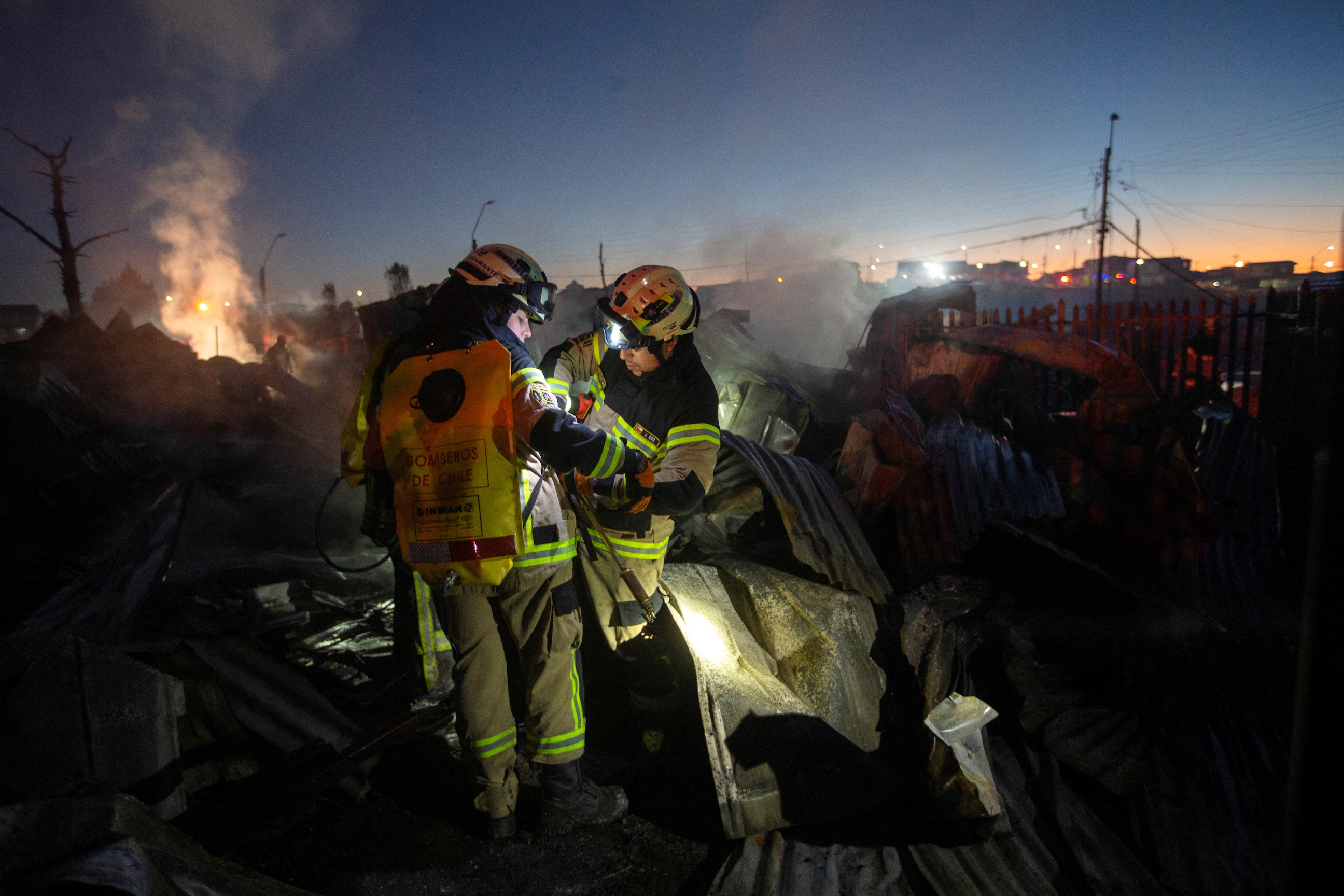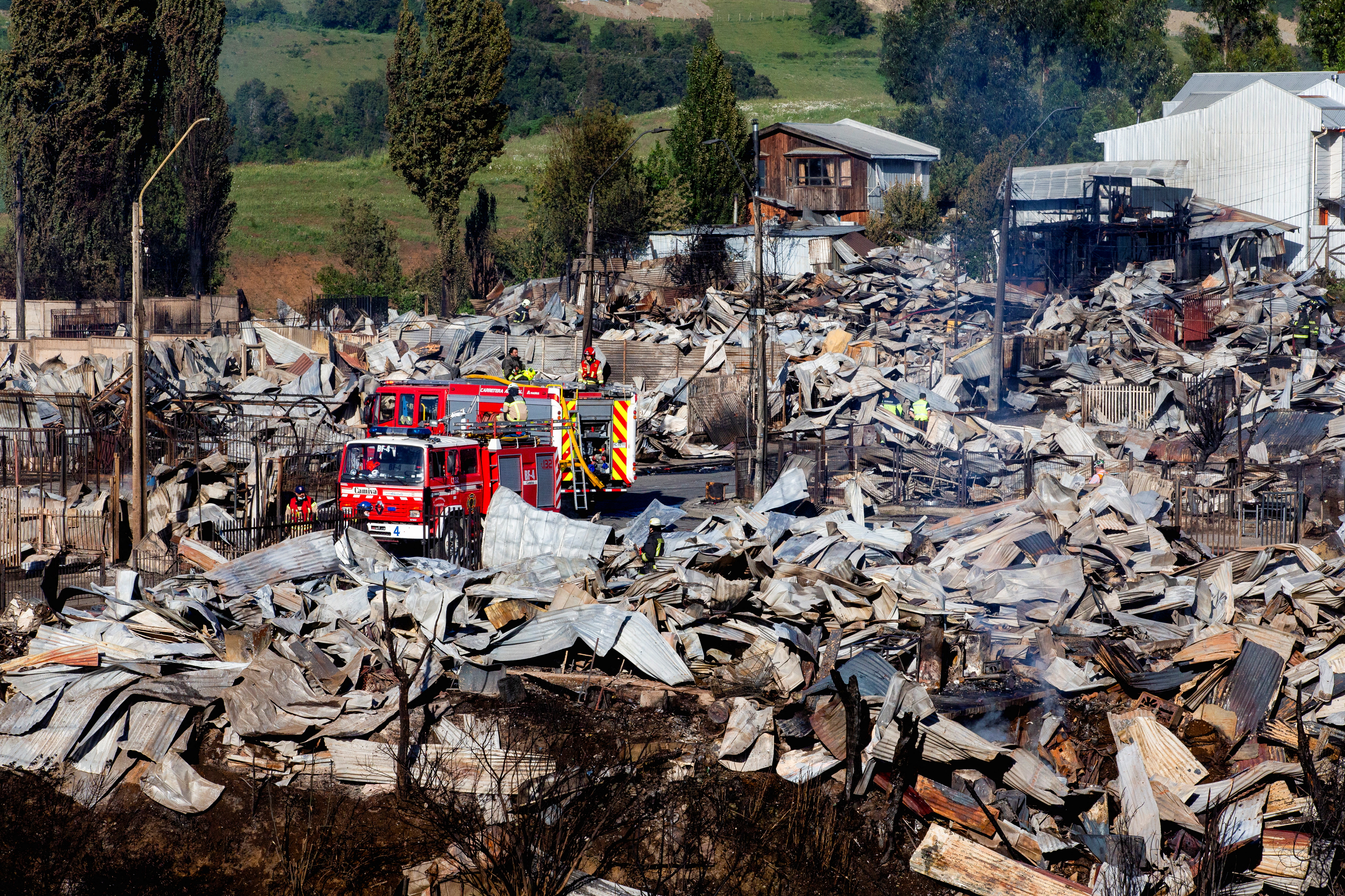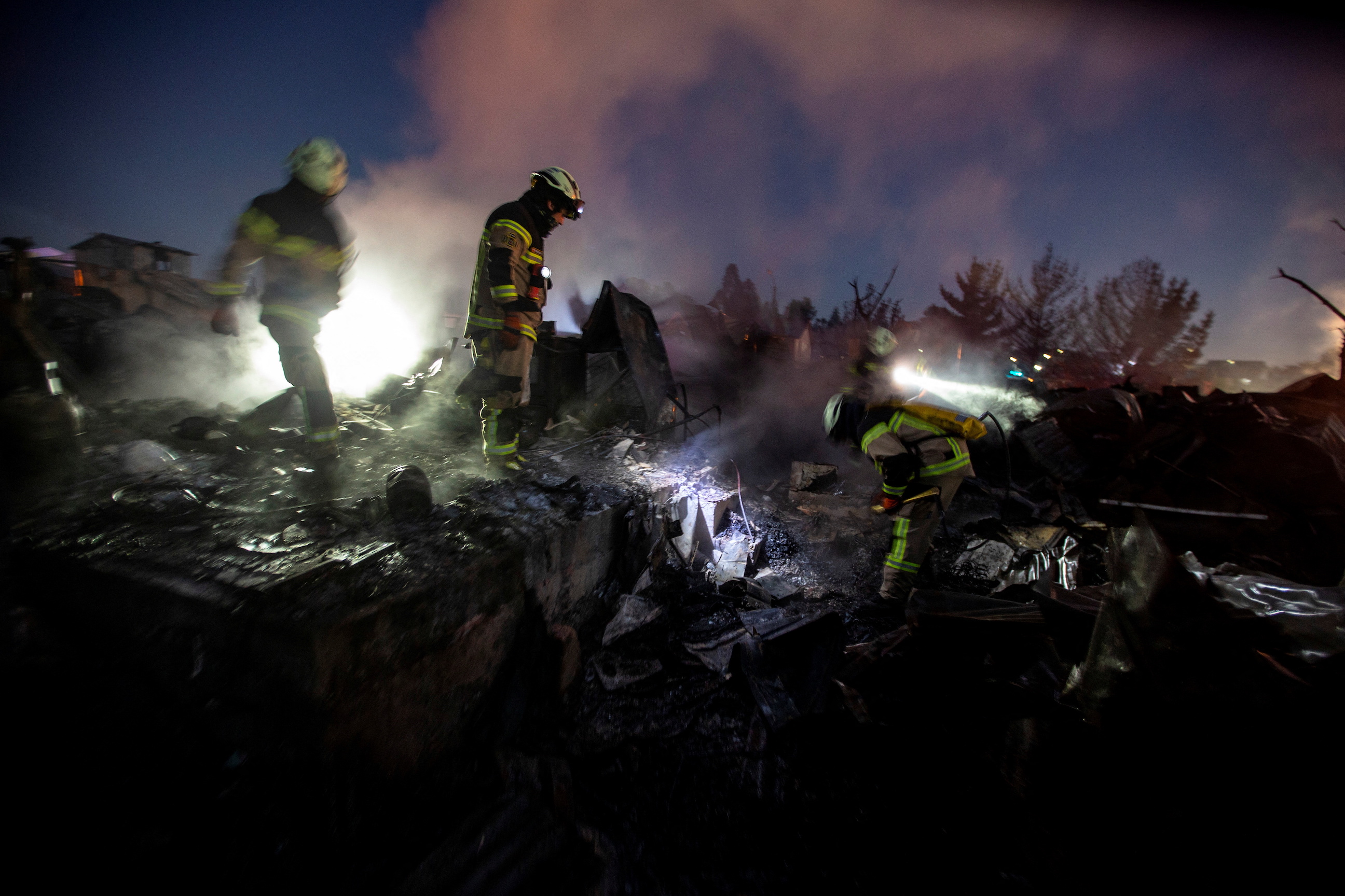 Emergency workers searched the smoldering rubble. More than 300 personnel battled the blaze, with at least 15 volunteers reported injured, all are in stable condition.