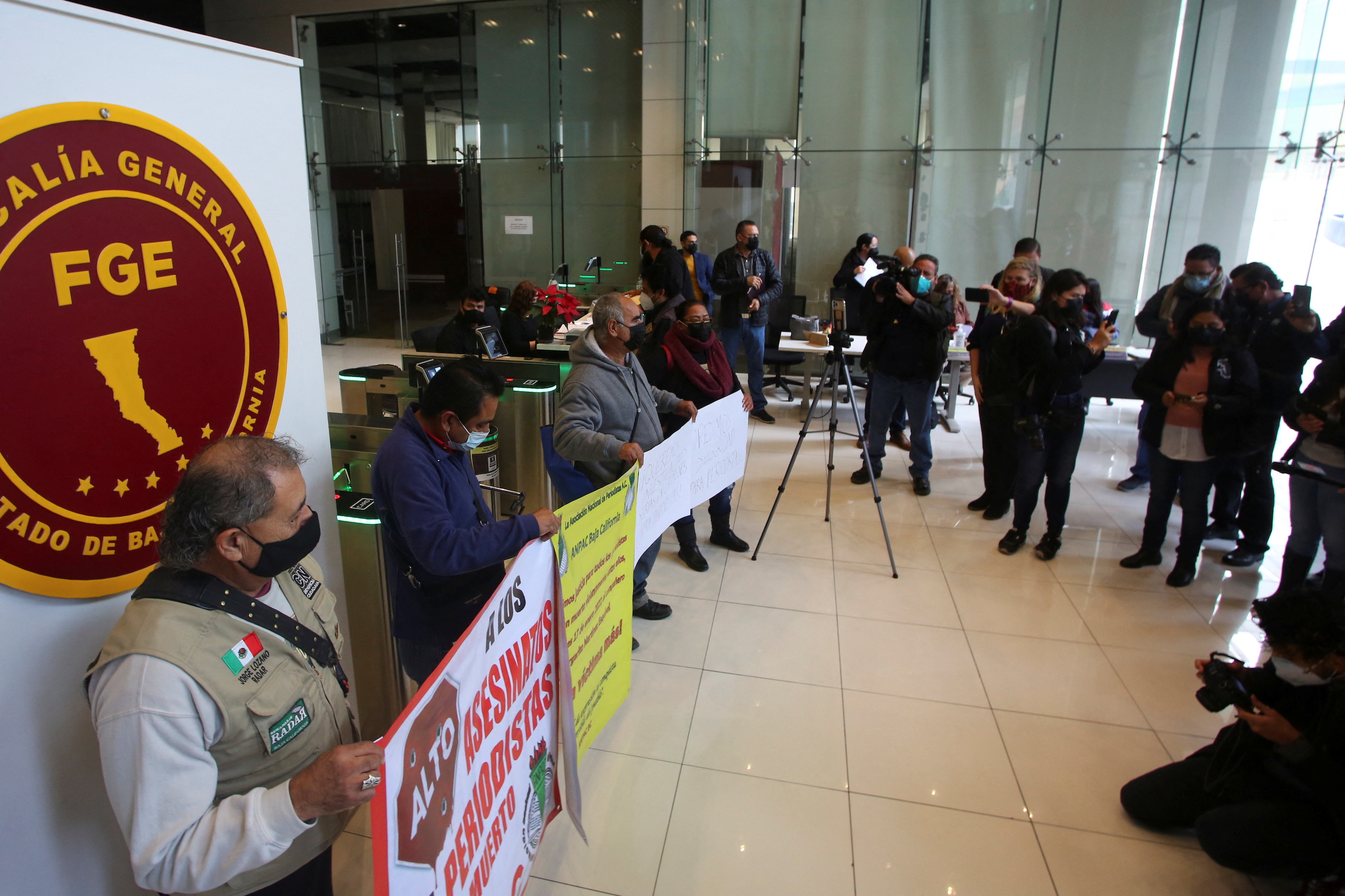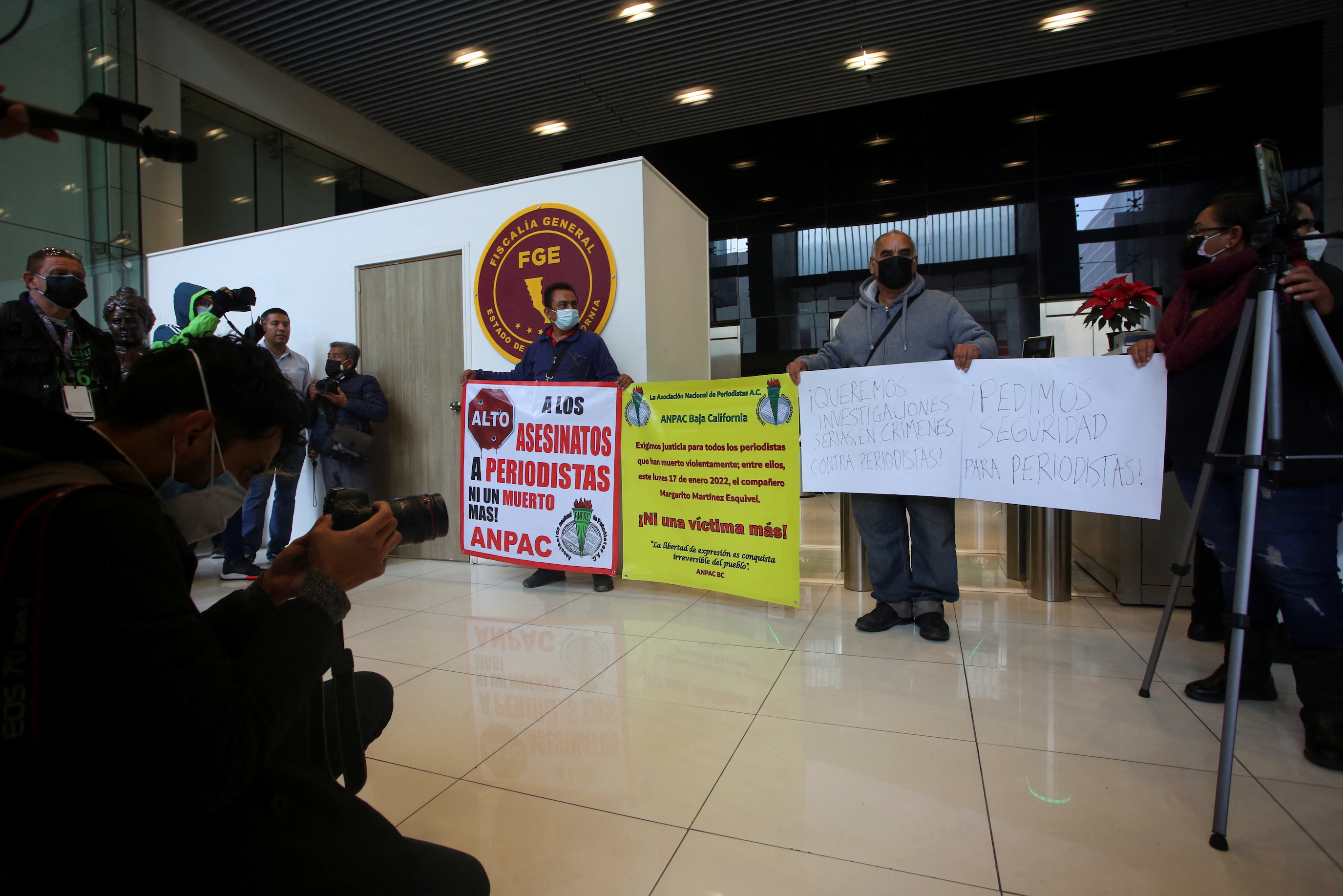 Mexican journalists gathered at the Baja California Attorney General’s office on Tuesday ahead of a press conference to demand justice and express alarm. Martinez Esquivel, 49, worked for more than a decade in Tijuana covering the gang crime and violence.