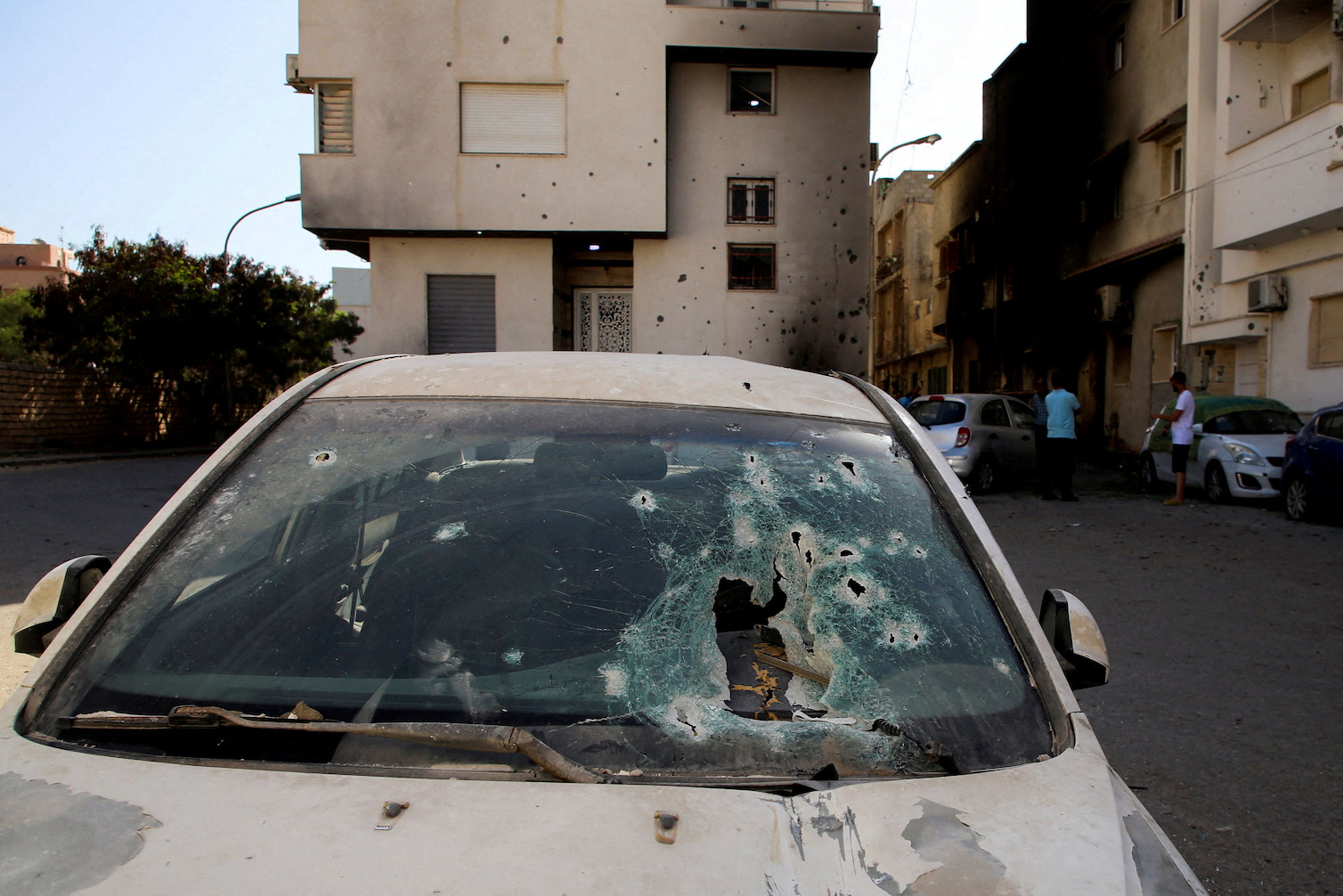 Holes are seen in the windshield of a destroyed car following clashes in Tripoli, Libya August 28, 2022. REUTERS/Hazem Ahmed