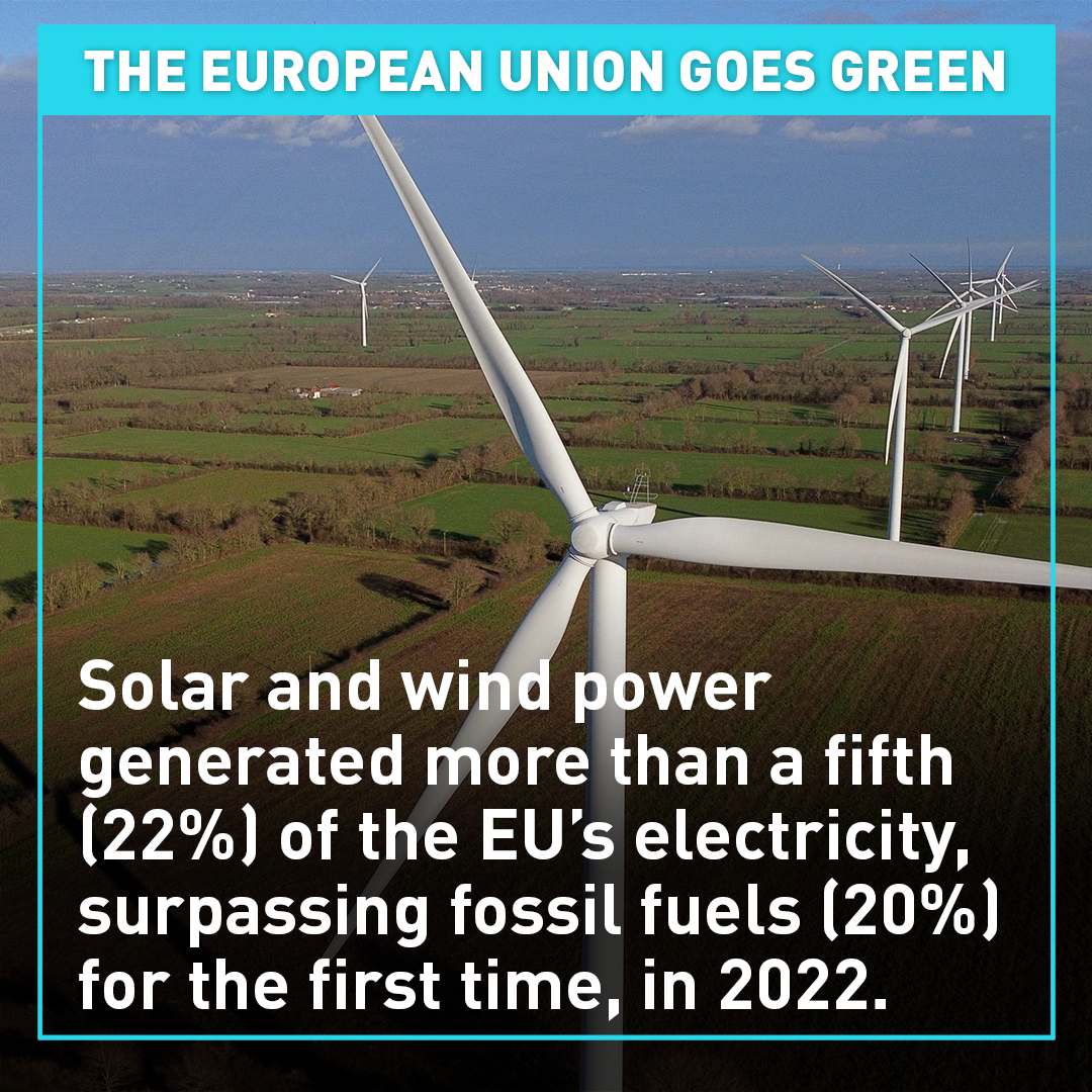 But in 2022, solar and wind power generated more than a fifth (22%) of the European Union's electricity, surpassing fossil fuels (20%) for the first time.