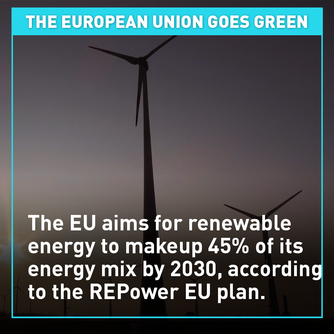 The EU says it expects renewable energy sources to makeup 45% of its energy mix by 2030, according to the REPower EU plan.