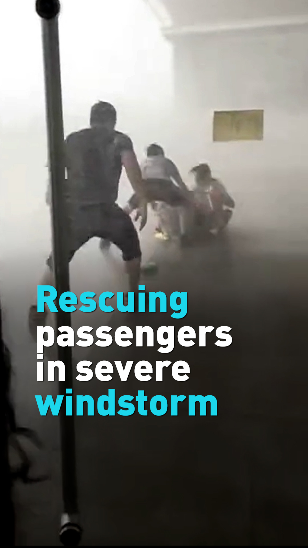 A severe storm swept across east China's Yantai City on July 25. Passengers sheltering from the rain at a railway station braved the strong wind to rescue a mother and daughter.